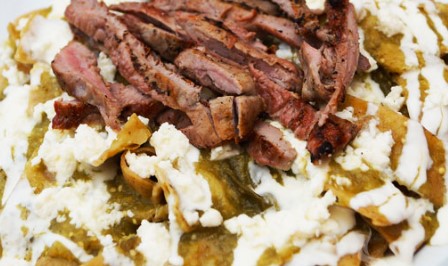 tortilla horneada bañada en salsa roja, crema, queso, cebolla y aguacate servido con bistec a la plancha