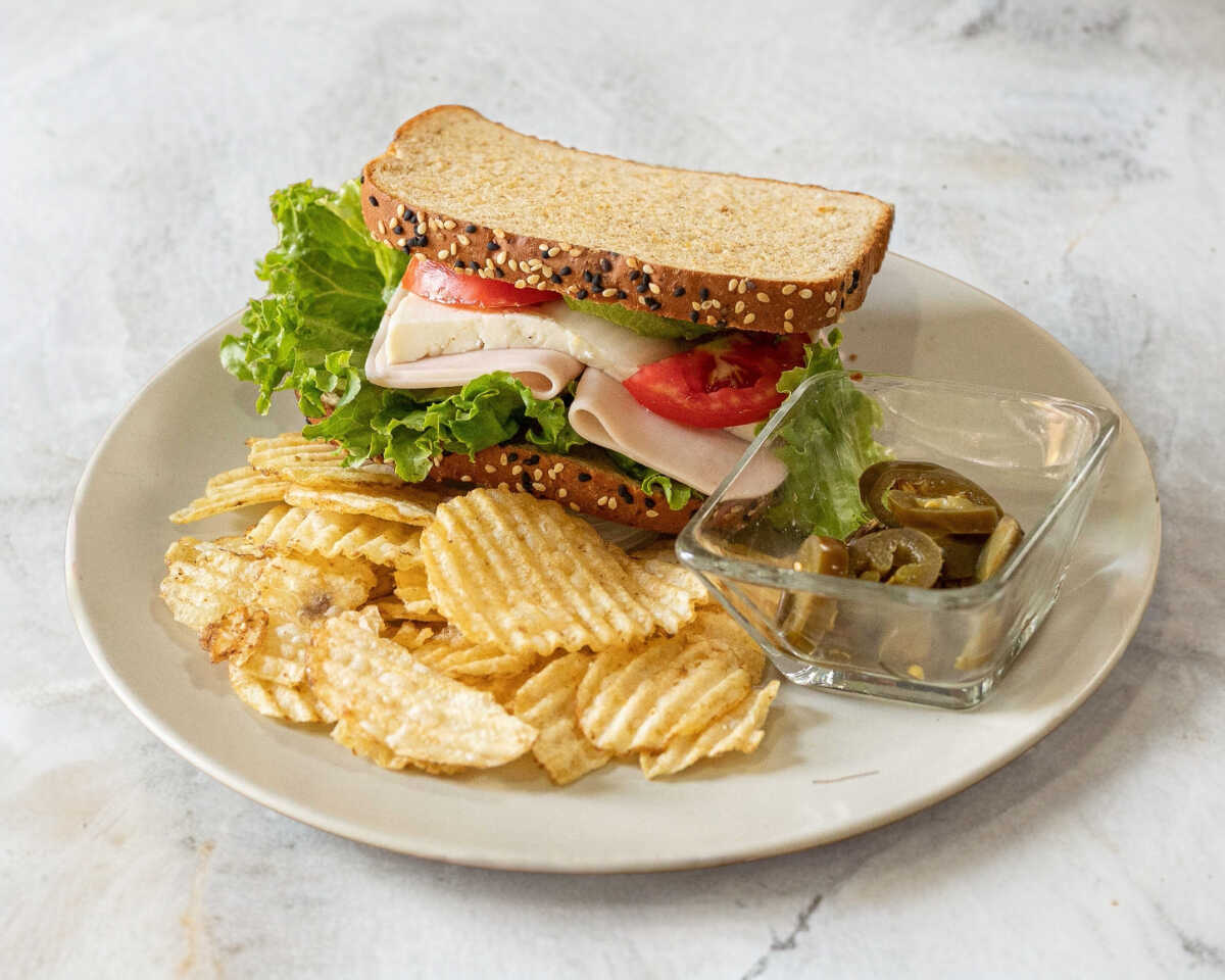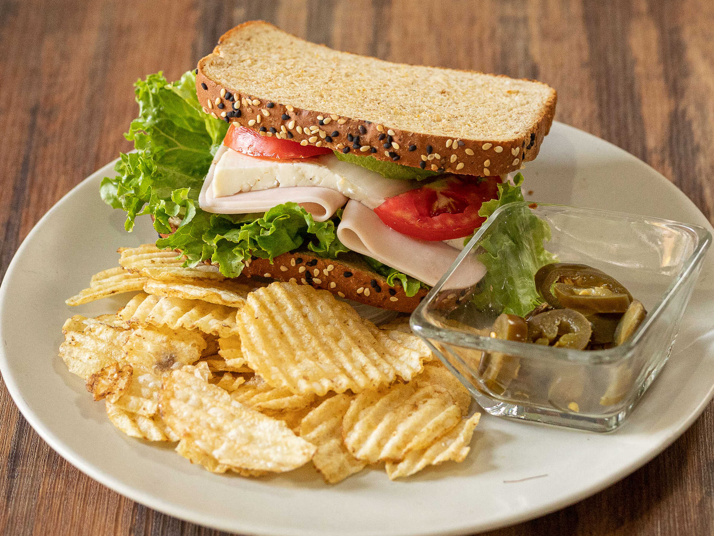 pan integral, jamon, pechuga de pavo, queso panela, lechuga, jitomate, cebolla aguacate y pepino acompañado de papas