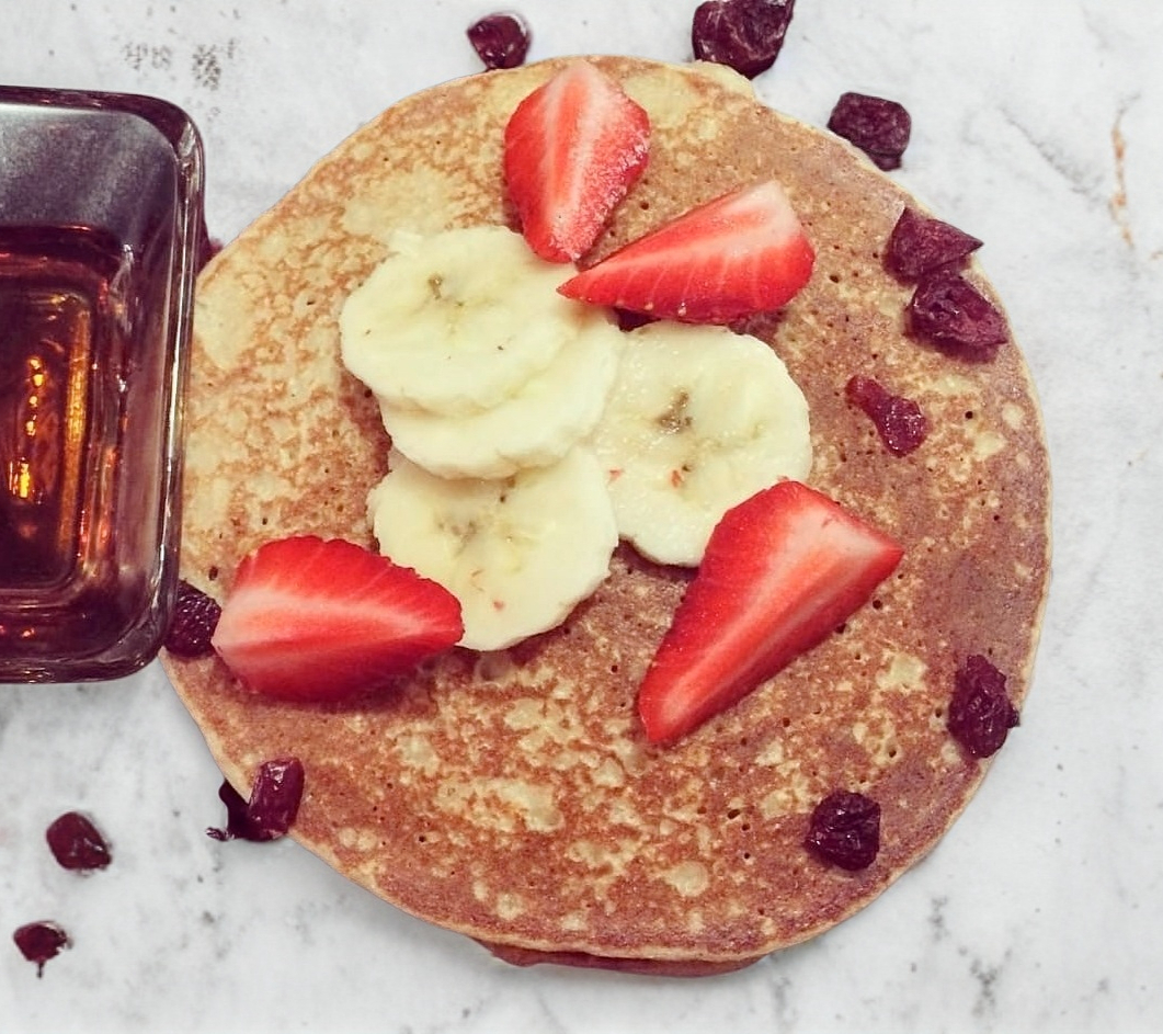3 pzas integrales hechos con harina de avena, servidos con frutas y tu topping preferido