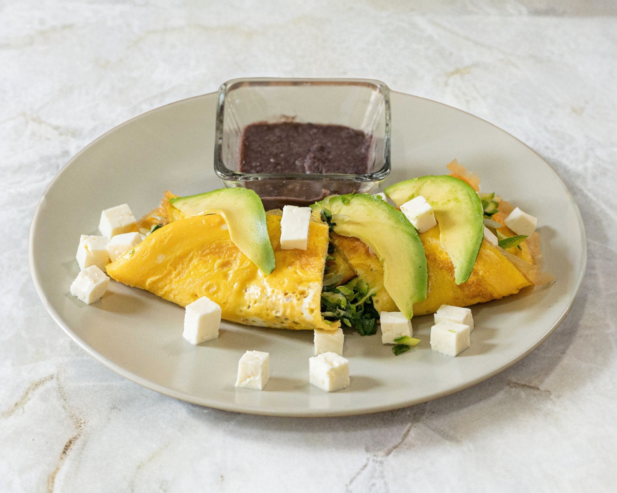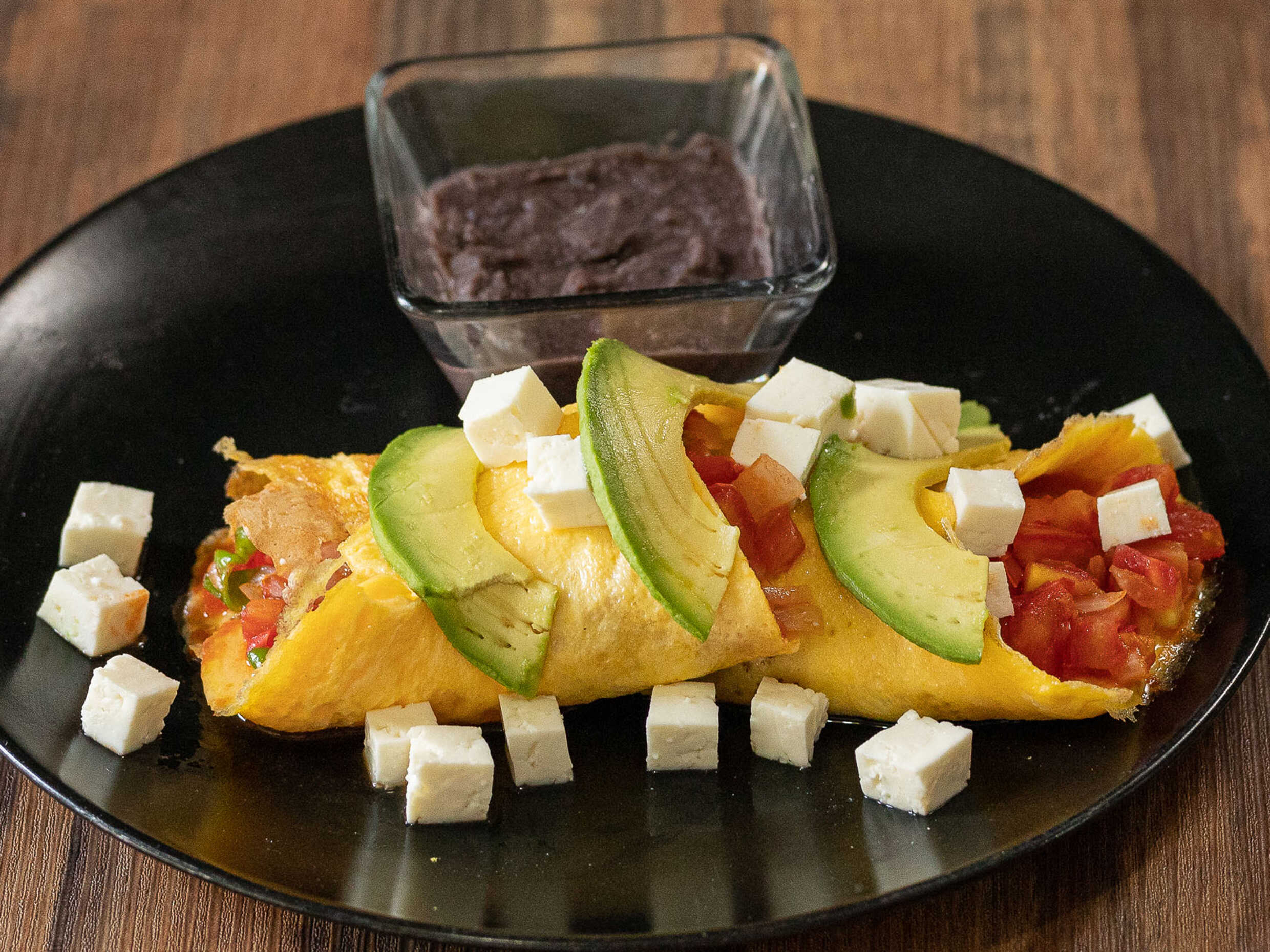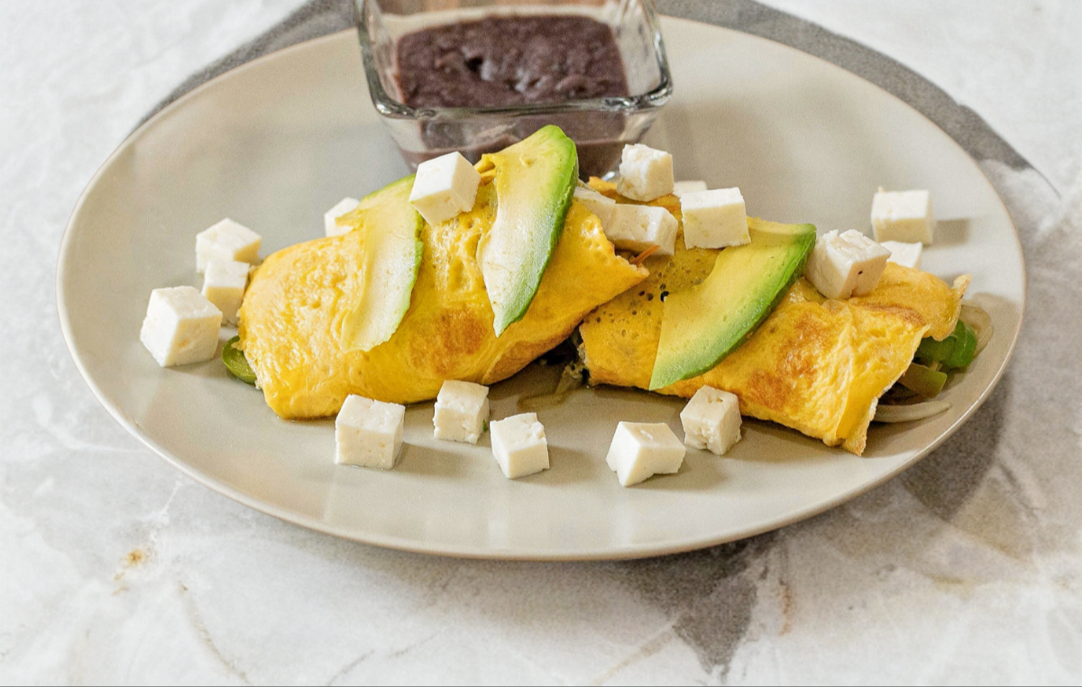 cebolla, espinaca, champiñon, queso panela, pimiento, acompañado frijoles tortilla o pan