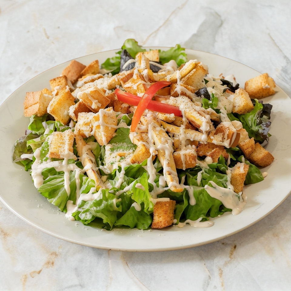 lechuga, pollo asado, aderezo cesar, queso parmesano, croutones