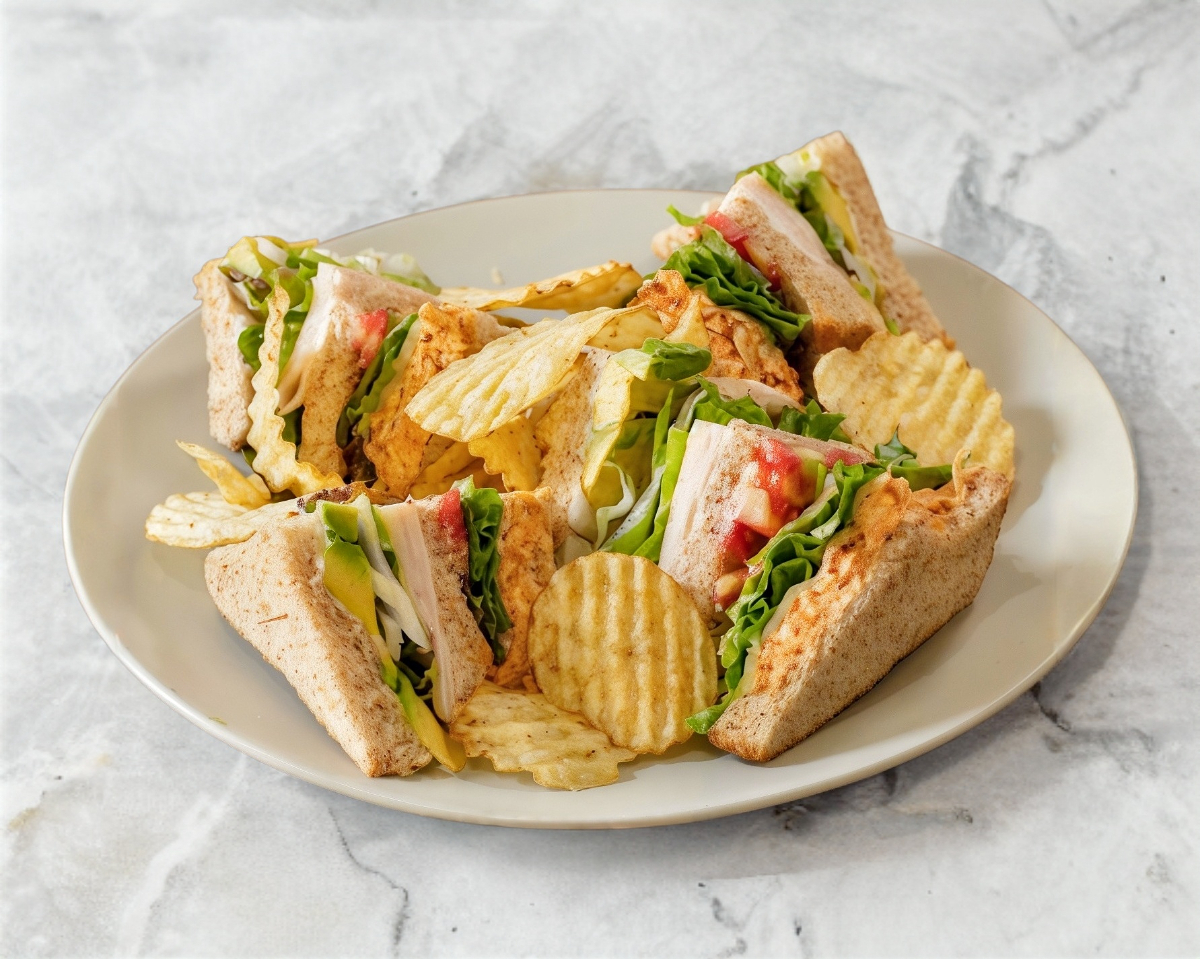 pan integral, jamon pechuga de pavo, queso manchego, pollo, lechuga, tomate, aguacate y cebolla acompañado de papas