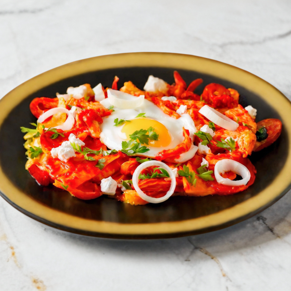 tortilla horneada bañada en salsa roja, crema, queso, cebolla y aguacate servido con huevo estrellado