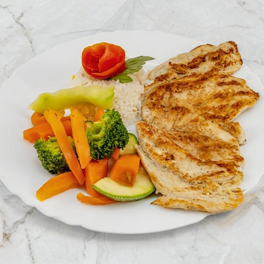 pechuga de pollo a la plancha acompañado de arroz al vapor ensalada verde o verduras. Incluye en agua del dia 500ml