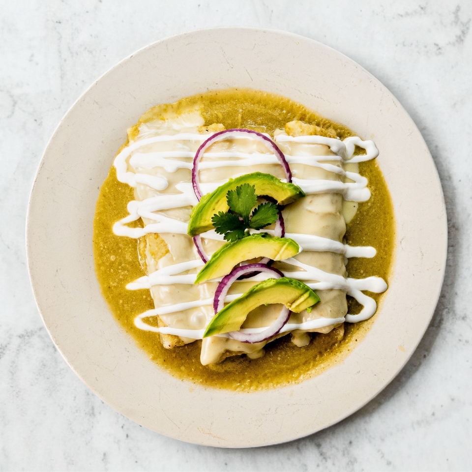 Tortilla rellena de pollo bañada en salsa verde ,gratinada con queso