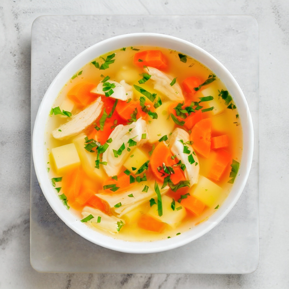 Consome de pollo con verduras , pollo , queso en cubitos y aguacate. Incluye agua del dia de 500ml.