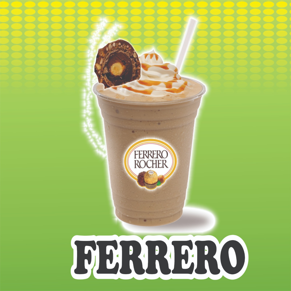 Leche , hielo ,café instantáneo, chocolate Ferrero , azúcar ,crema Chantilly ,chocolate Hershey's, servido en vaso de 16OZ