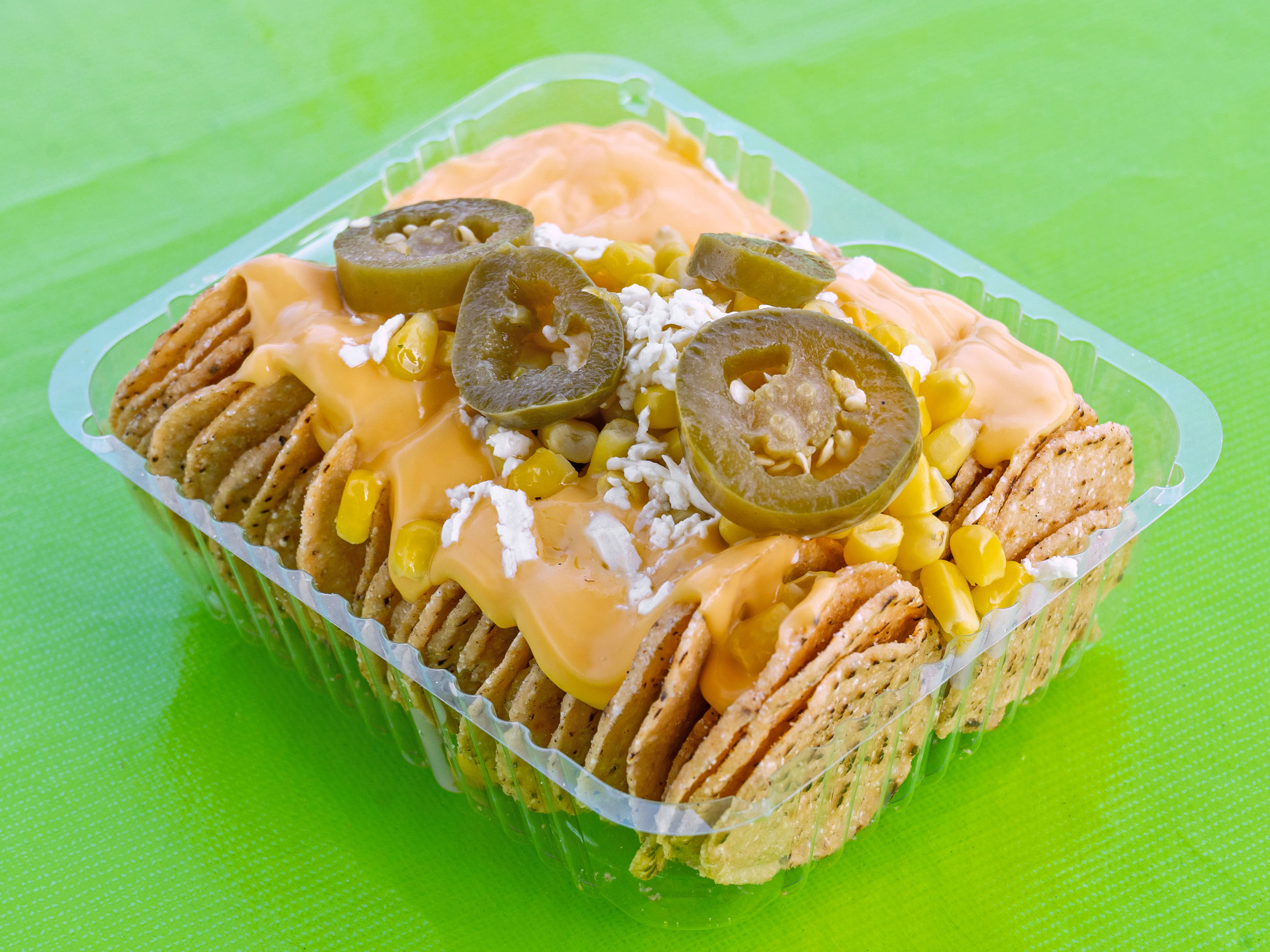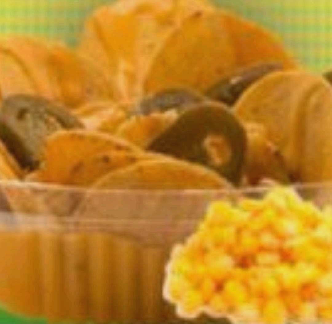 Tortilla nachos preparados con queso amarillo , grano de elote amarillo y queso fresco