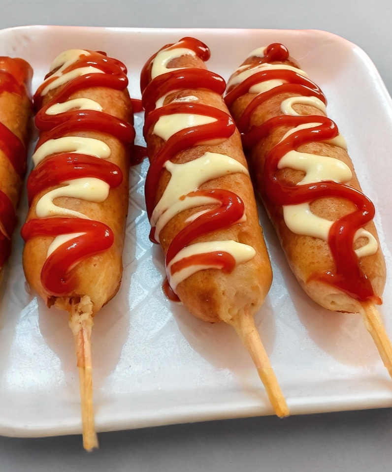 1 banderilla rica con salchicha, acompañada de cátsup y mostaza.