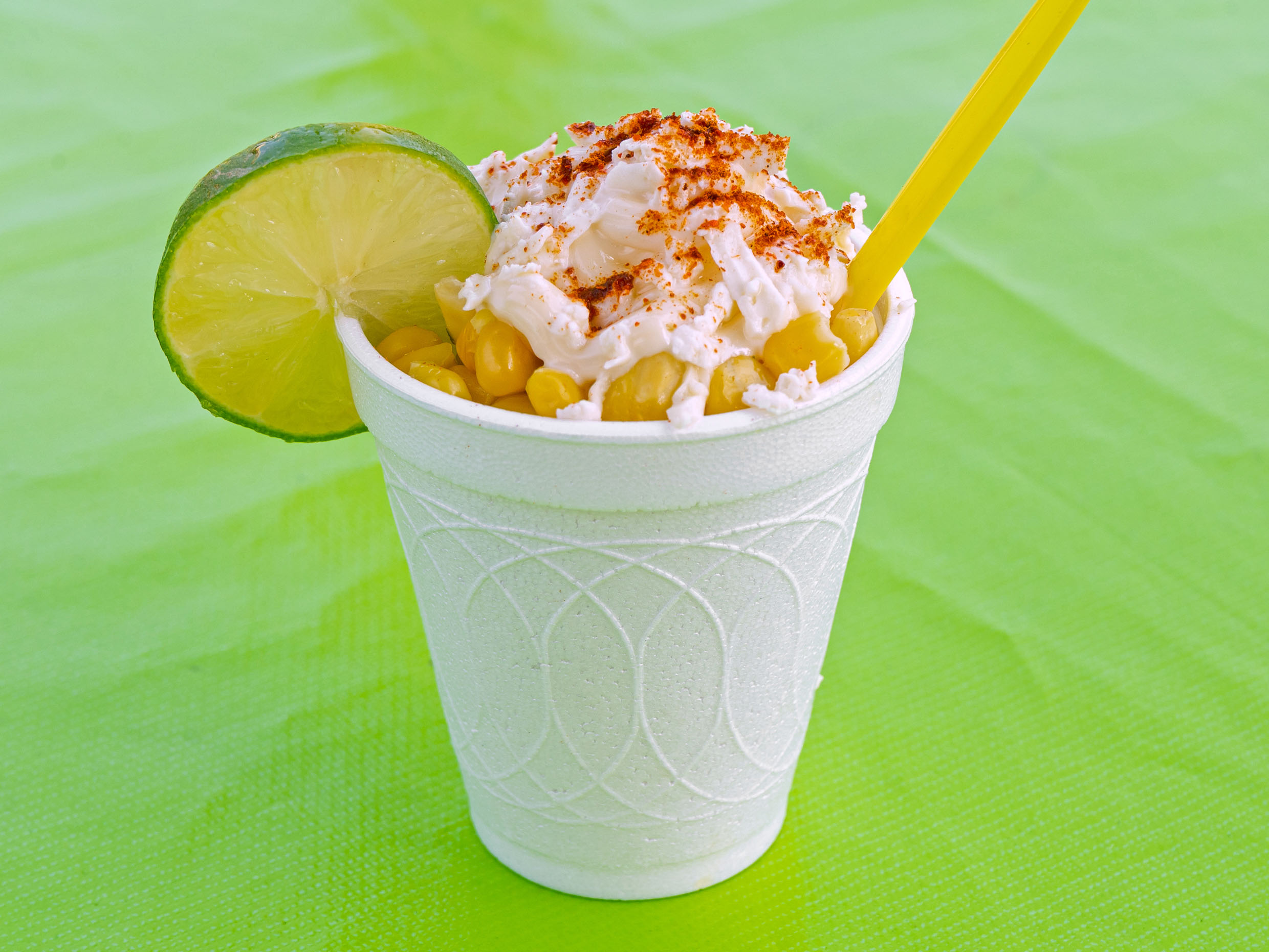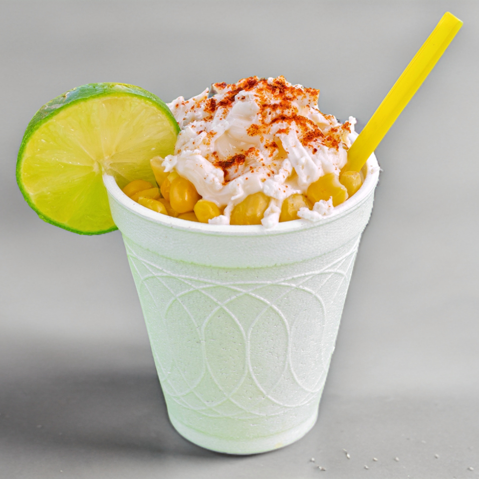 Grano de elote con mayonesa, crema, queso fresco, queso amarillo opcional, en vaso 10oz.