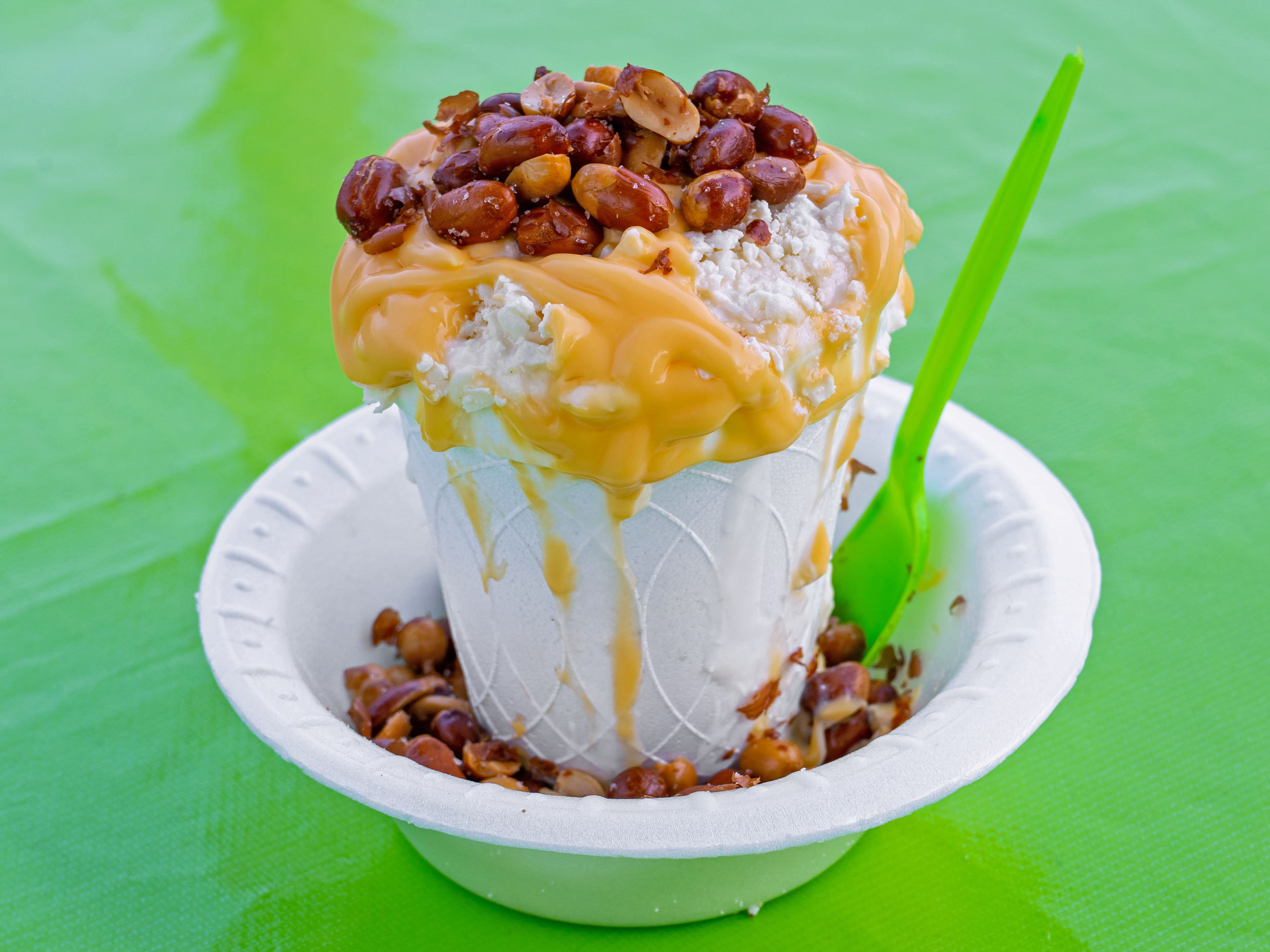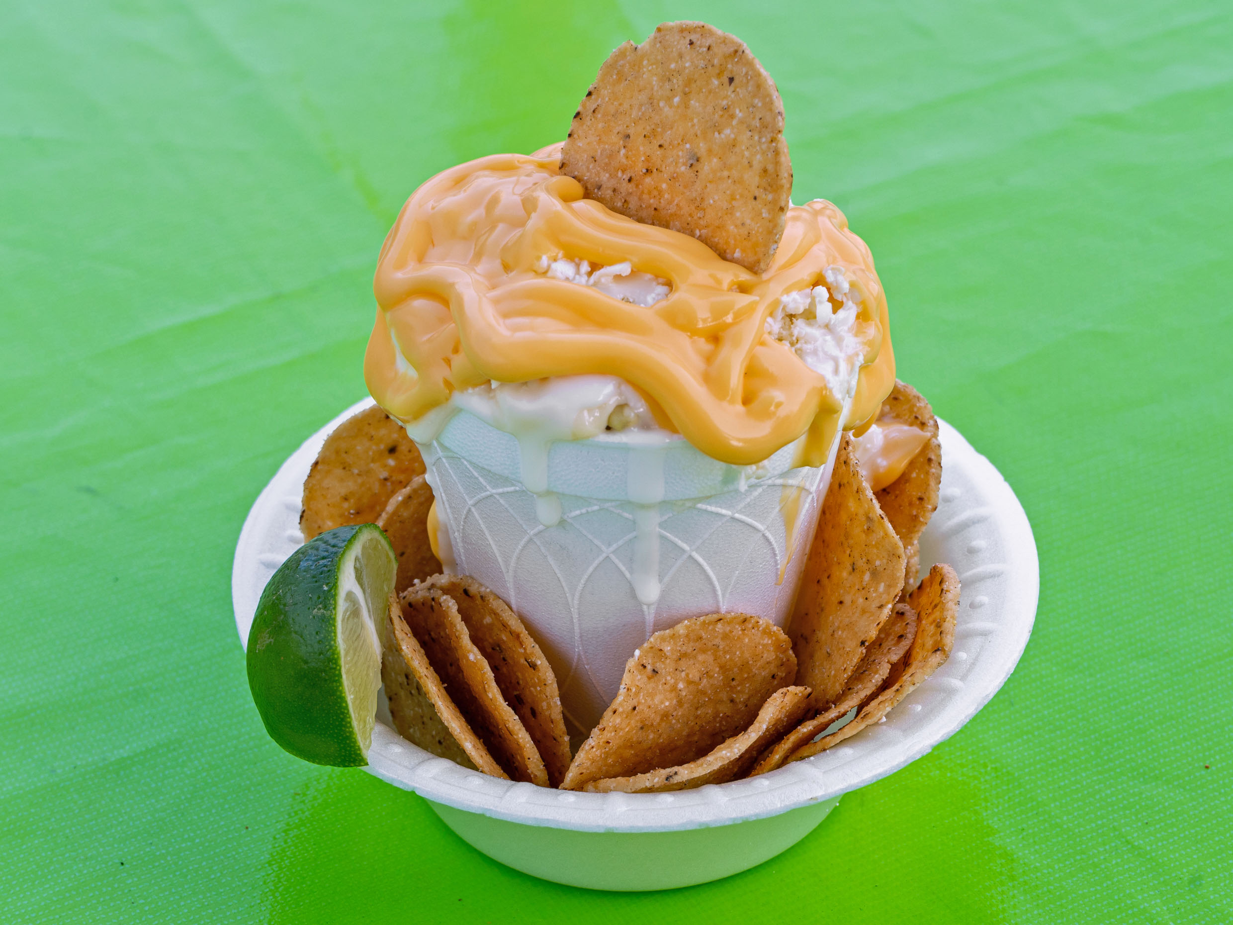 Cacahuate nipon acompañado de grano de elote amarillo con mayonesa crema y queso fresco.