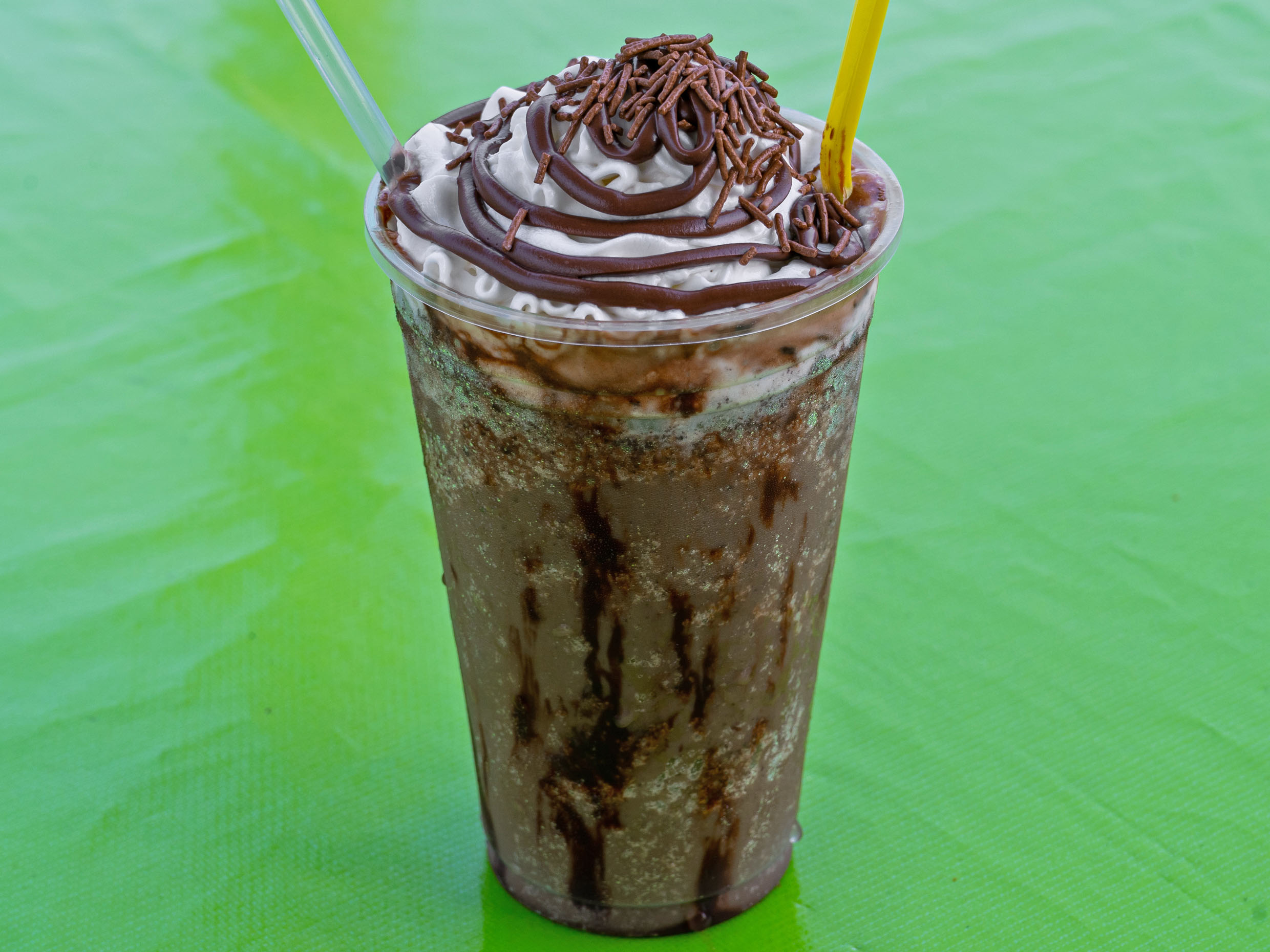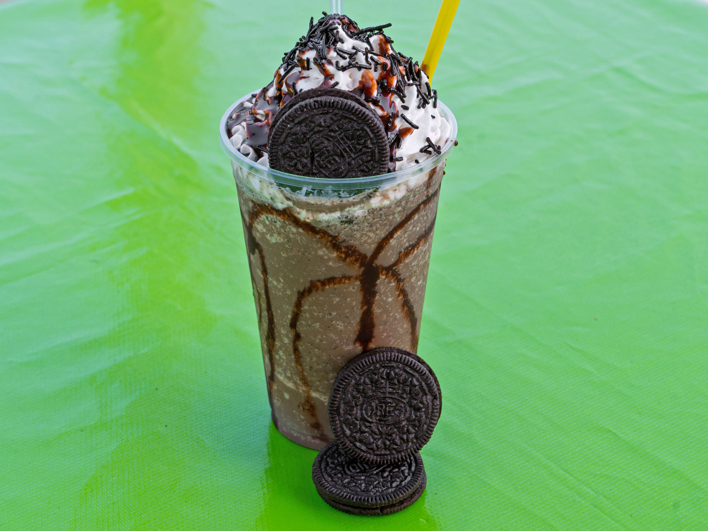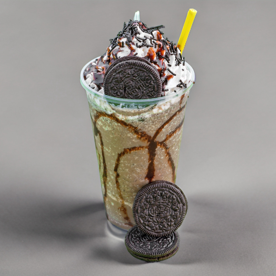 Frappe de 16 oz con leche, hielo, café instantáneo, galletas Oreo, azúcar, crema chantilly y chocolate Hershey’s.