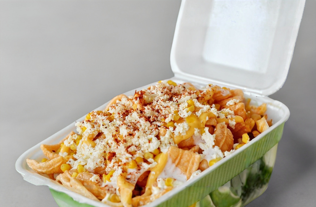Esquite de grano de elote, mayonesa, crema, 3 quesos seco fresco y amarillo servidos con botana (nachos o cacahuates), 6oz.