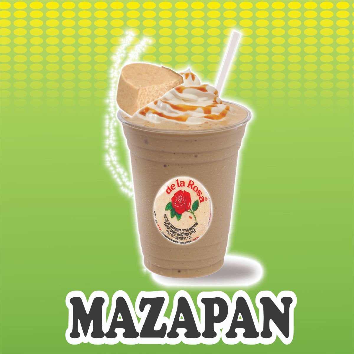 Leche ,hielo café instantáneo,mazapán, azúcar, crema Chantilly, dulce de leche servido en vaso de 16 OZ