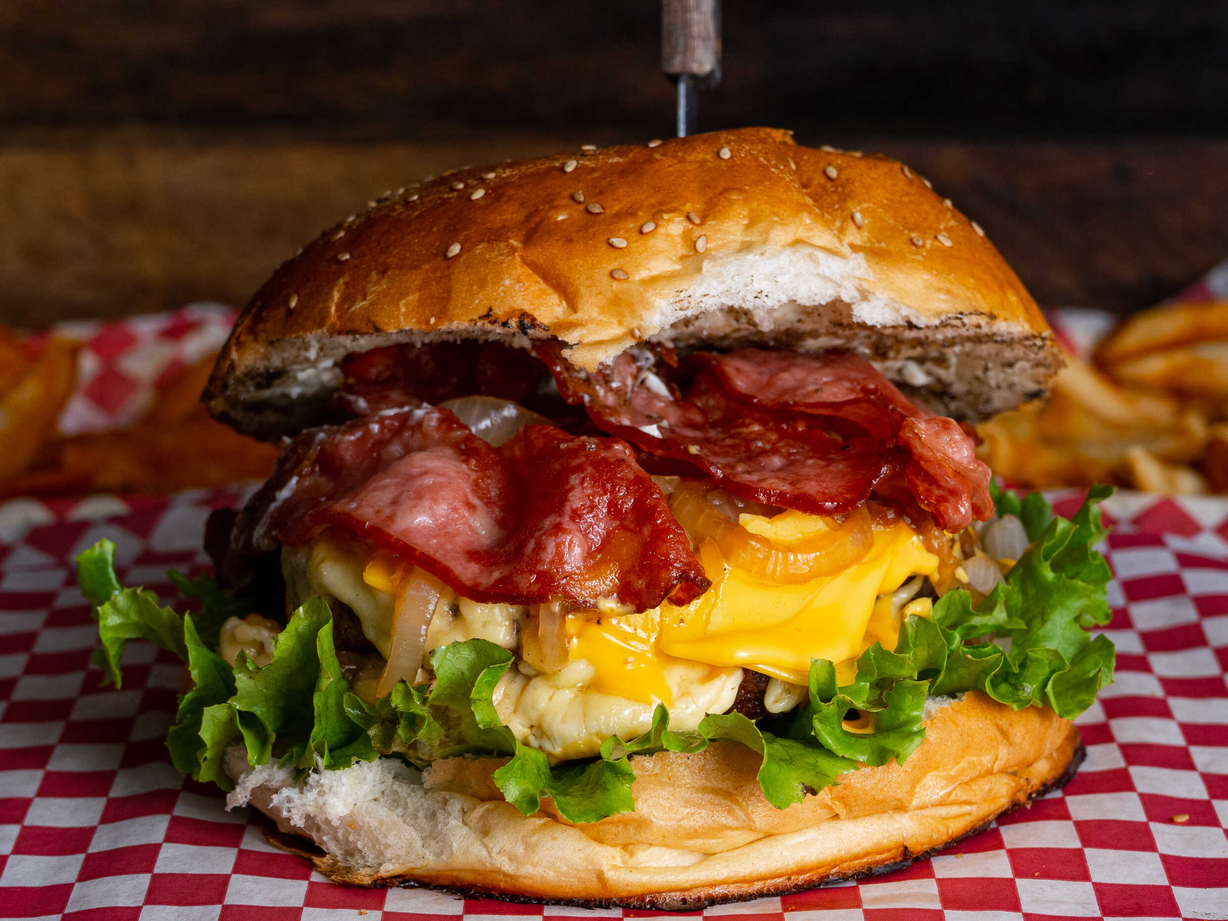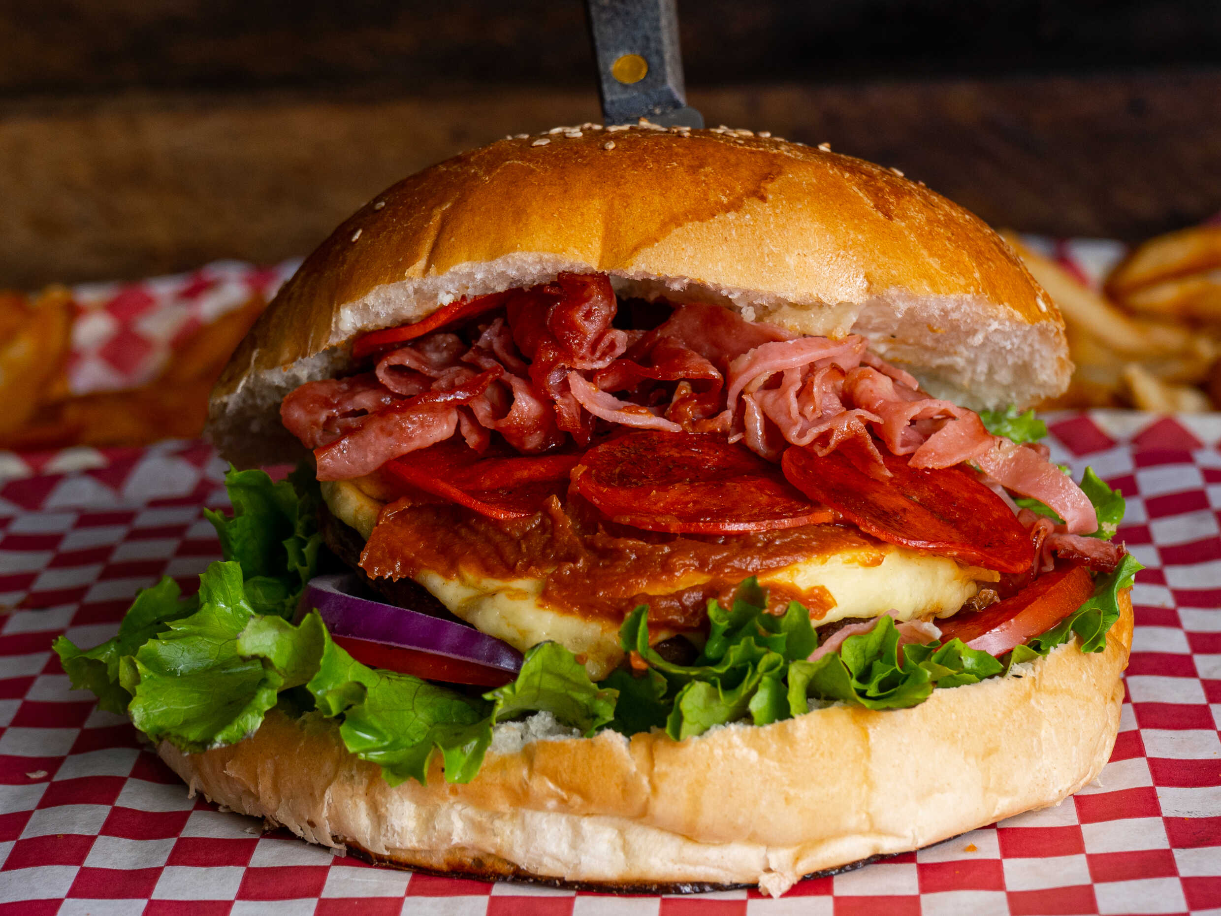 Doble carne de sirloin, doble queso gouda, doble queso american cheese, tocino cebolla caramelizada.