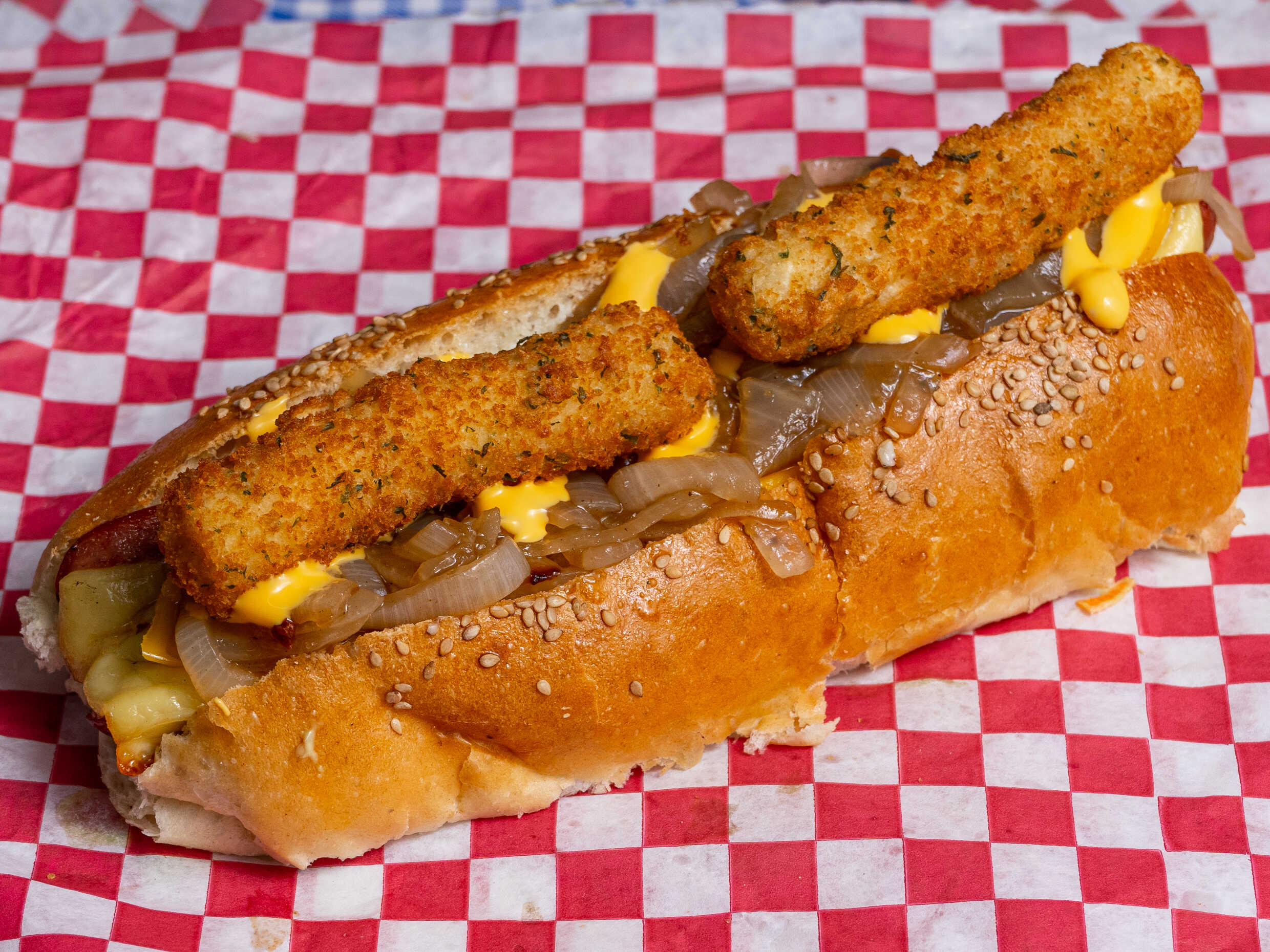 Salchicha de res 22 cm, acompañado de cebolla caramelizada al vino, salsa italiana, gratinado con queso y peperoni.