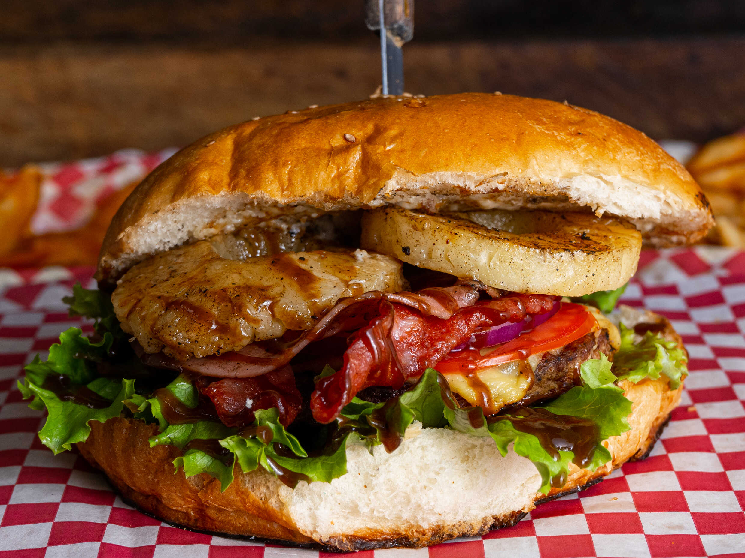 Especialidad de la casa, triple carne de sirloin, triple queso gouda, triple queso americano, triple tocino, piña, guacamole y cebolla caramelizada.