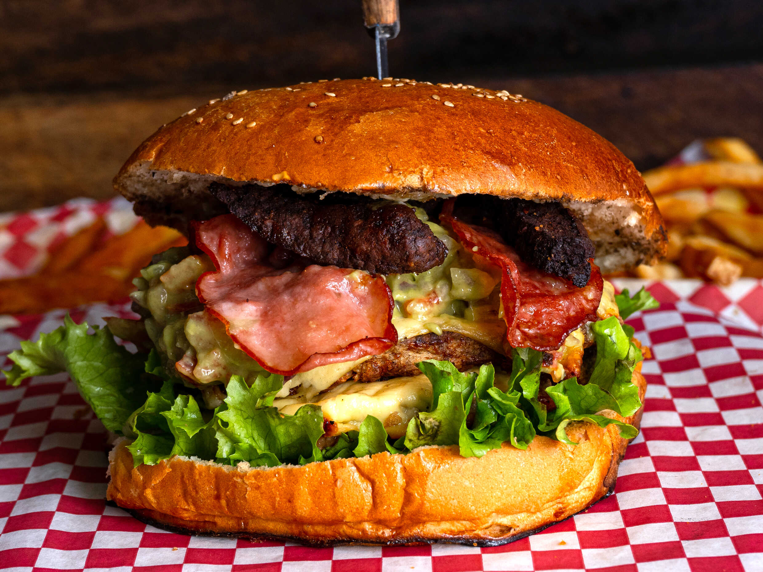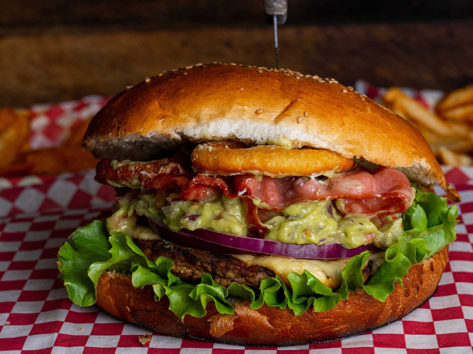 Doble carne de sirloin, doble queso gouda, tocino guacamole chorizo argentino.
