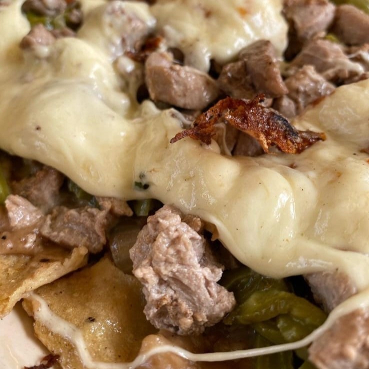 250 g De arrachera con tocino, morrón, cebolla y queso.