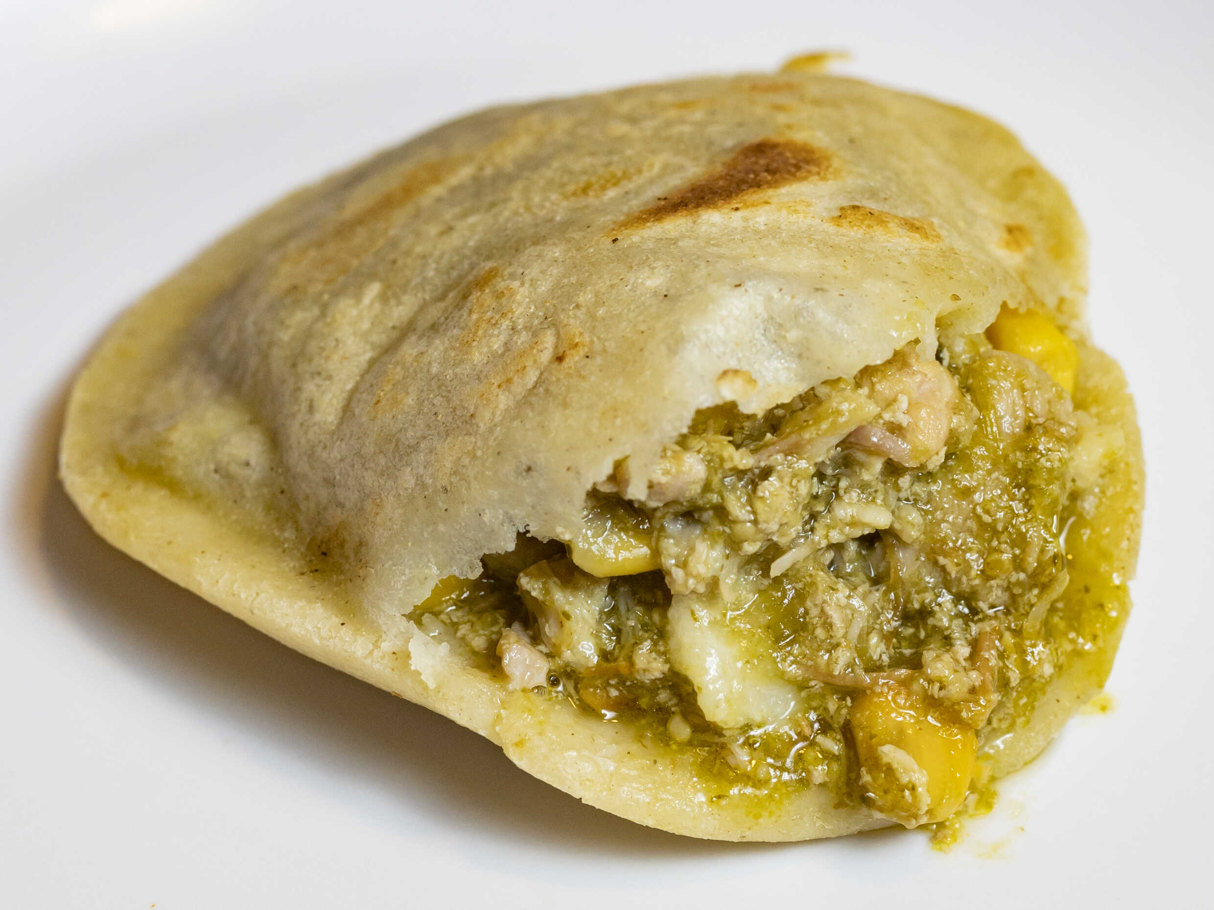 Torta de Pollo Pibil; preparada con mayonesa, frijolitos y pollo con pibil. ¡Calentada en la plancha!.