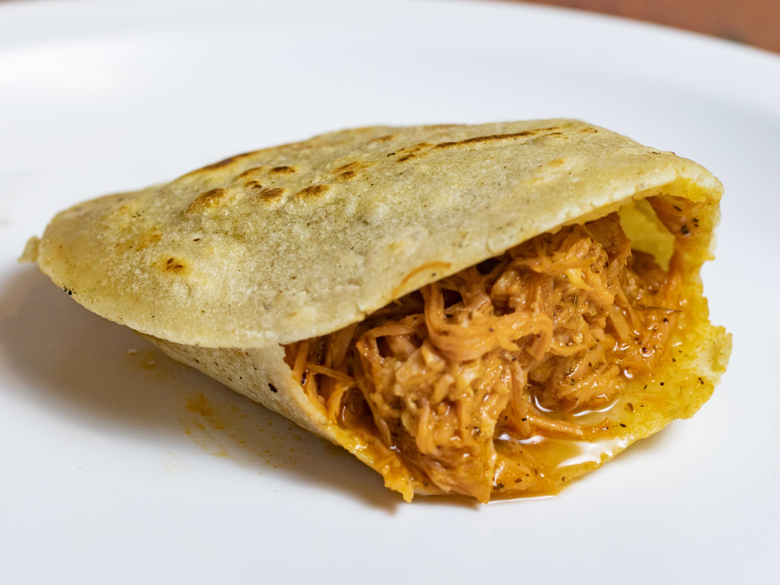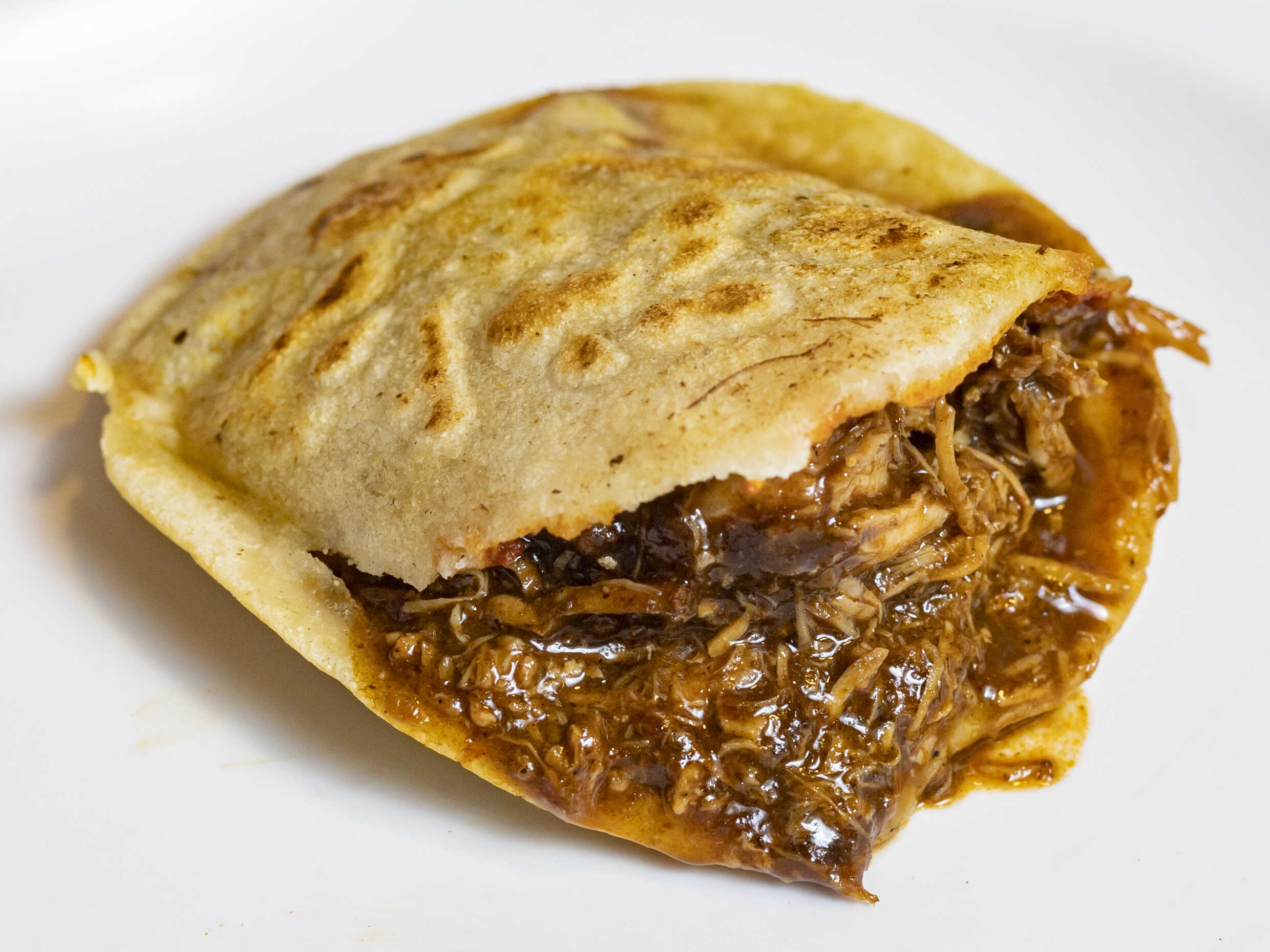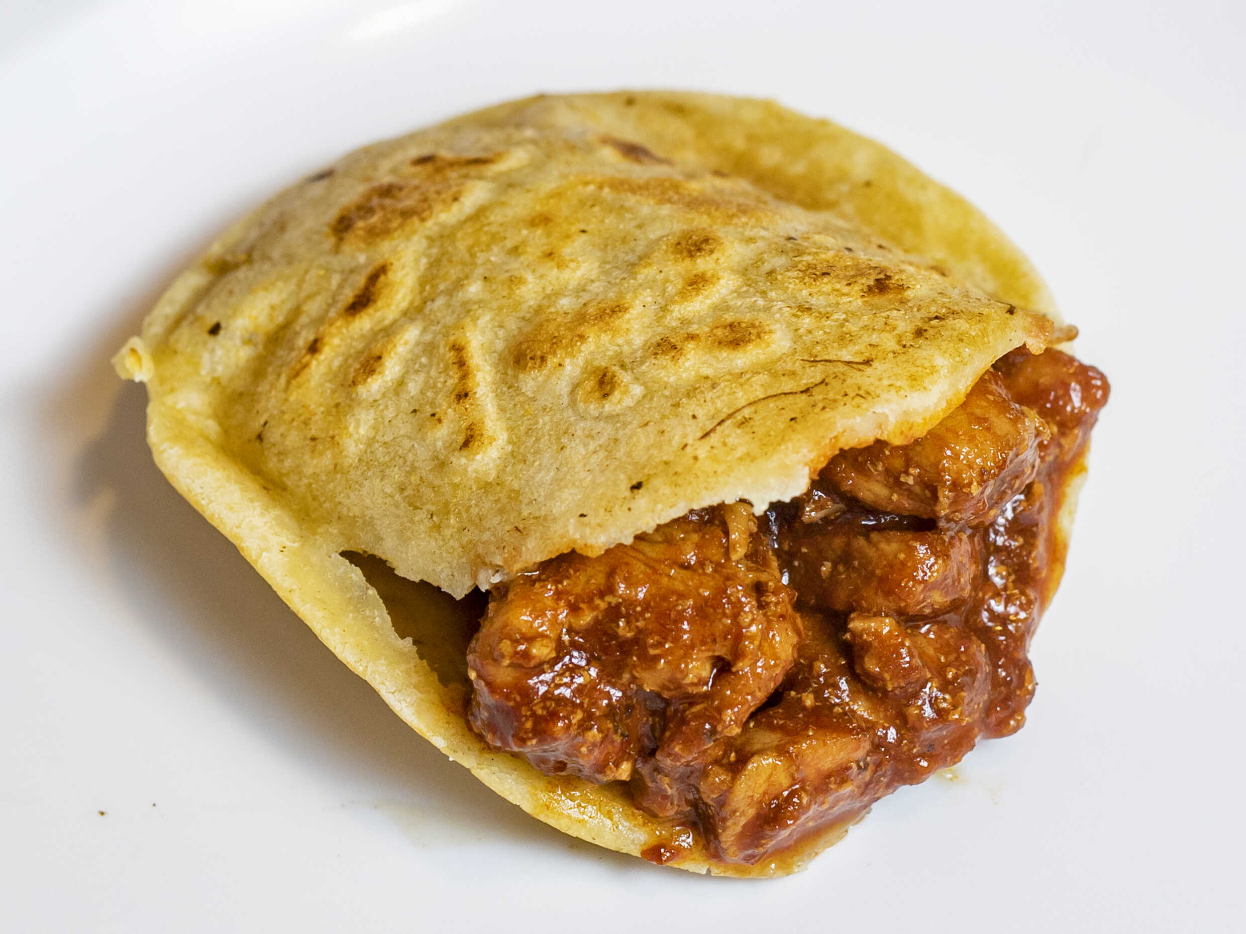 Torta de Pollo Pibil; preparada con mayonesa, frijolitos y pollo con pibil. ¡Calentada en la plancha!.