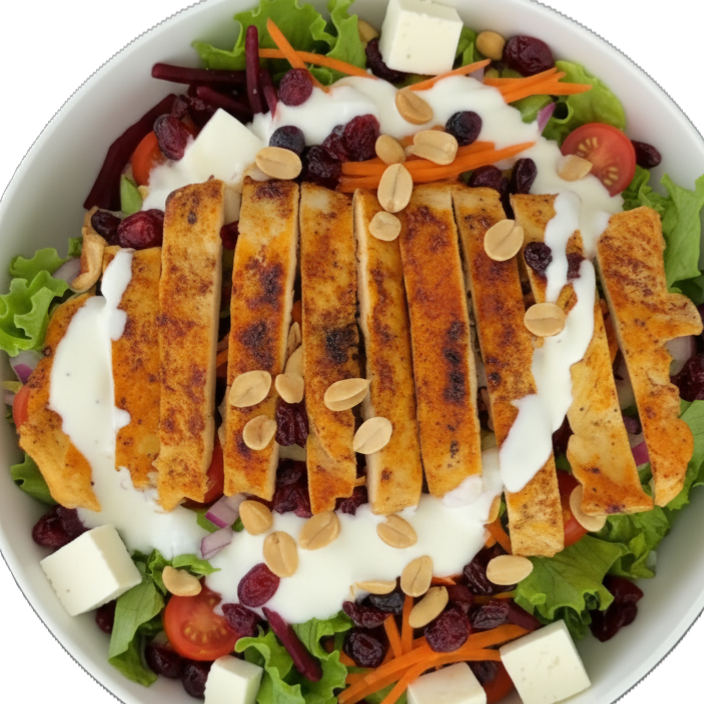 150g de pechuga de pollo al carbón. Una mezcla de lechuga italiana, col, betabel, zanahoria, jícama, queso panela, cacahuate tostado, arándano y aderezo a base de yogurt griego y piña