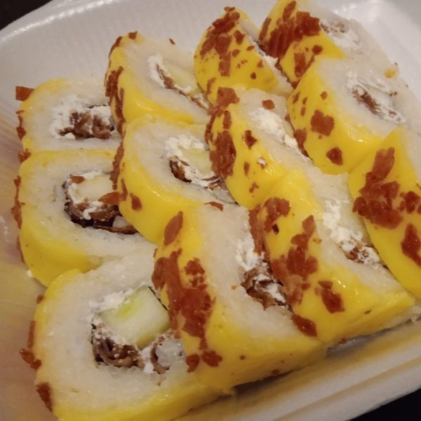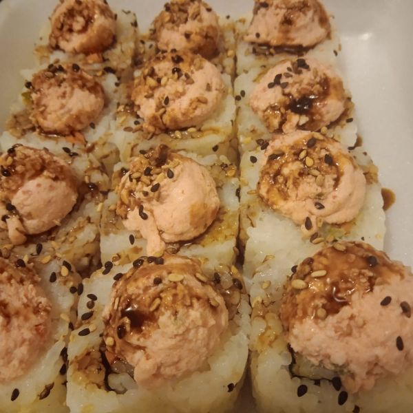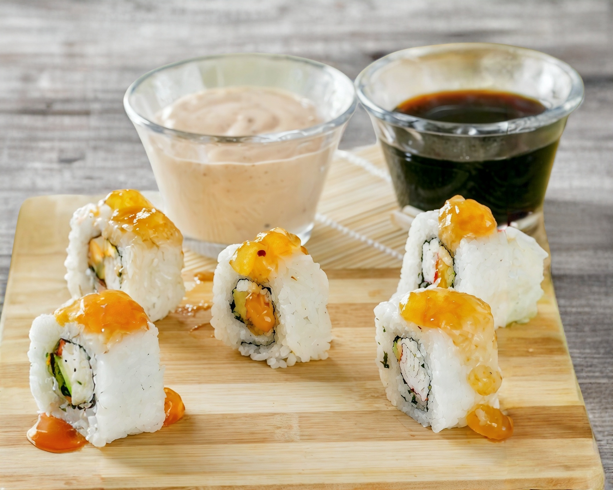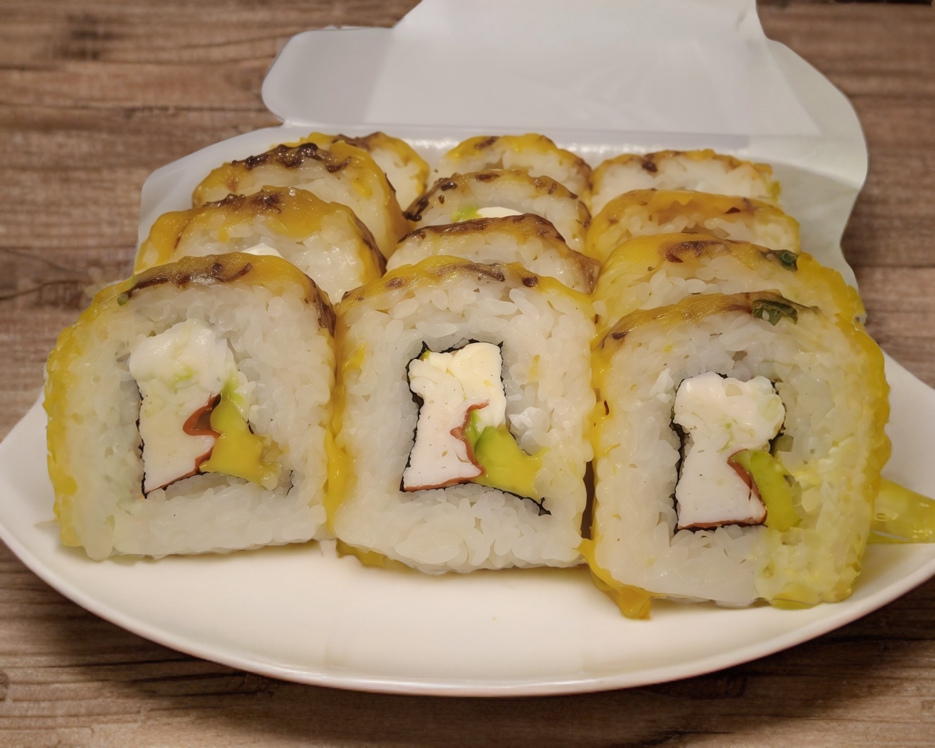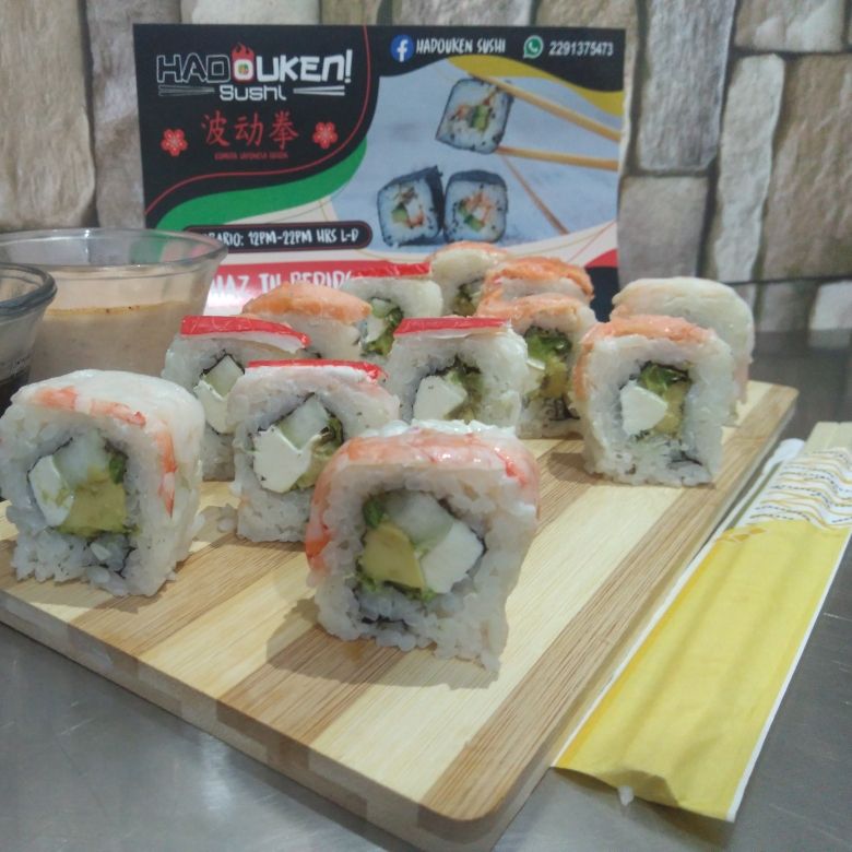 Por dentro queso philadelphia, aguacate, pepino, chile toreado, por fuera aderezo de chipotle, camarón, surimi y salmón.