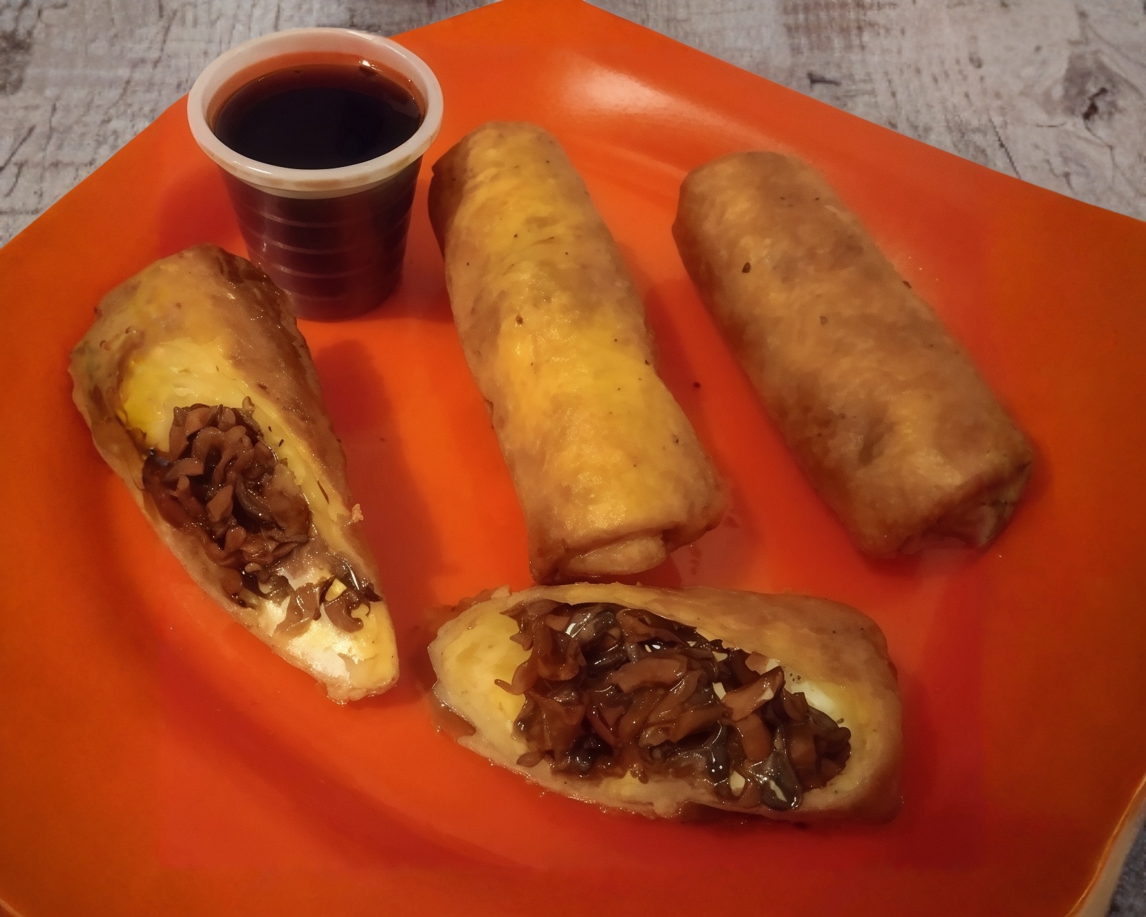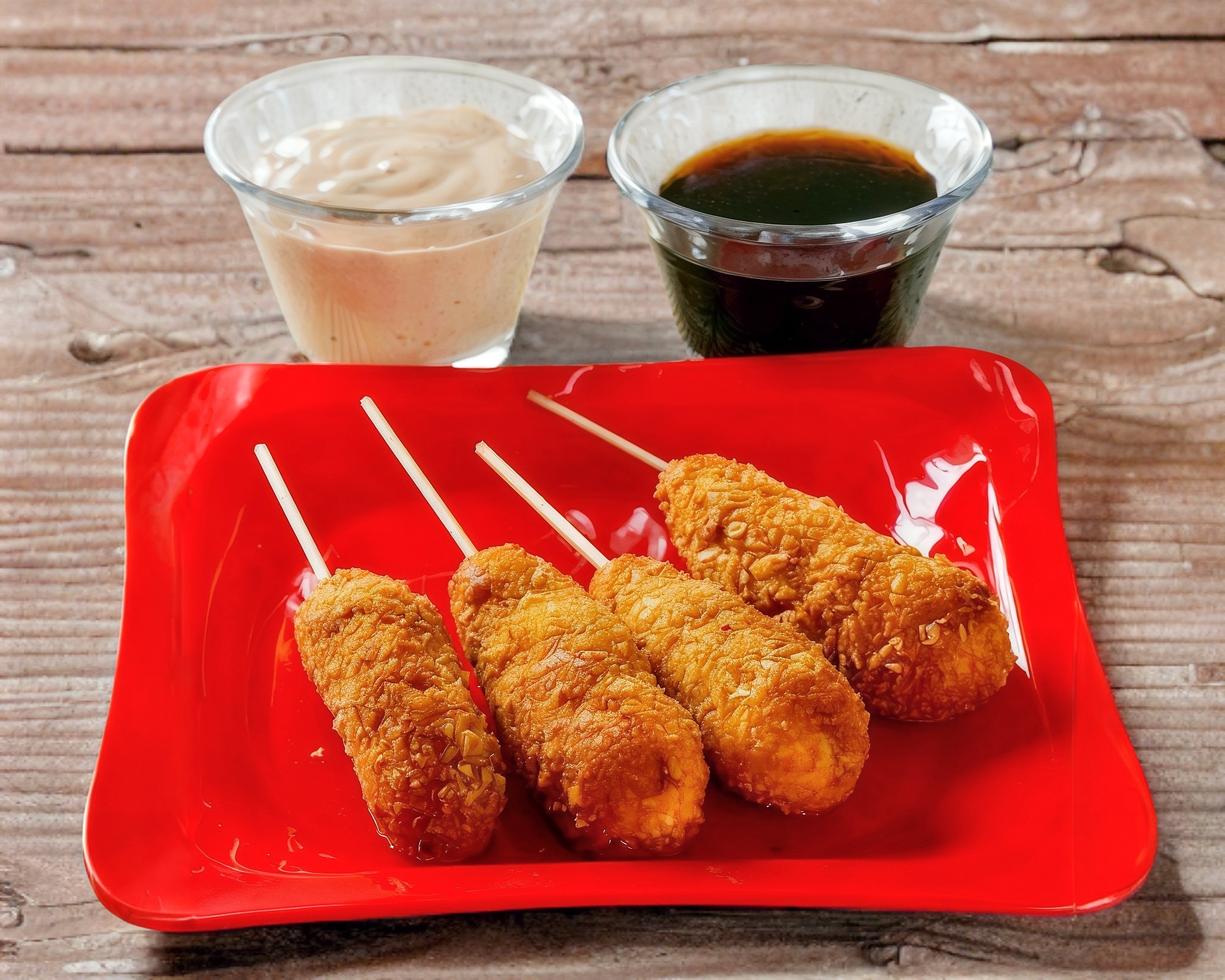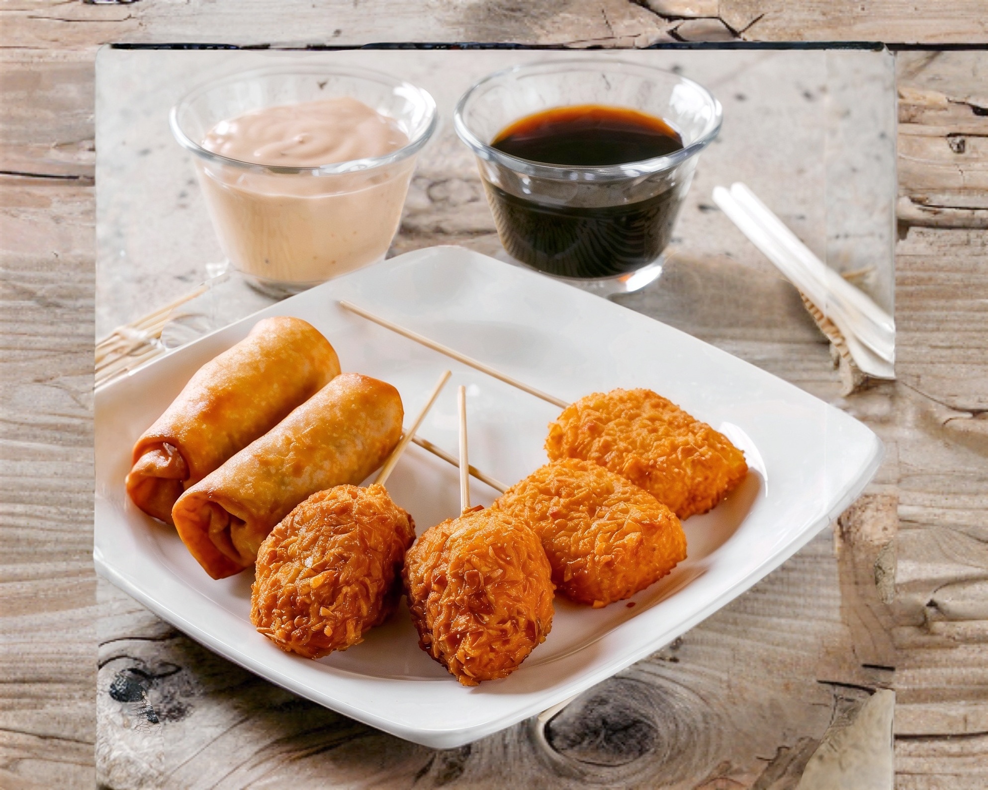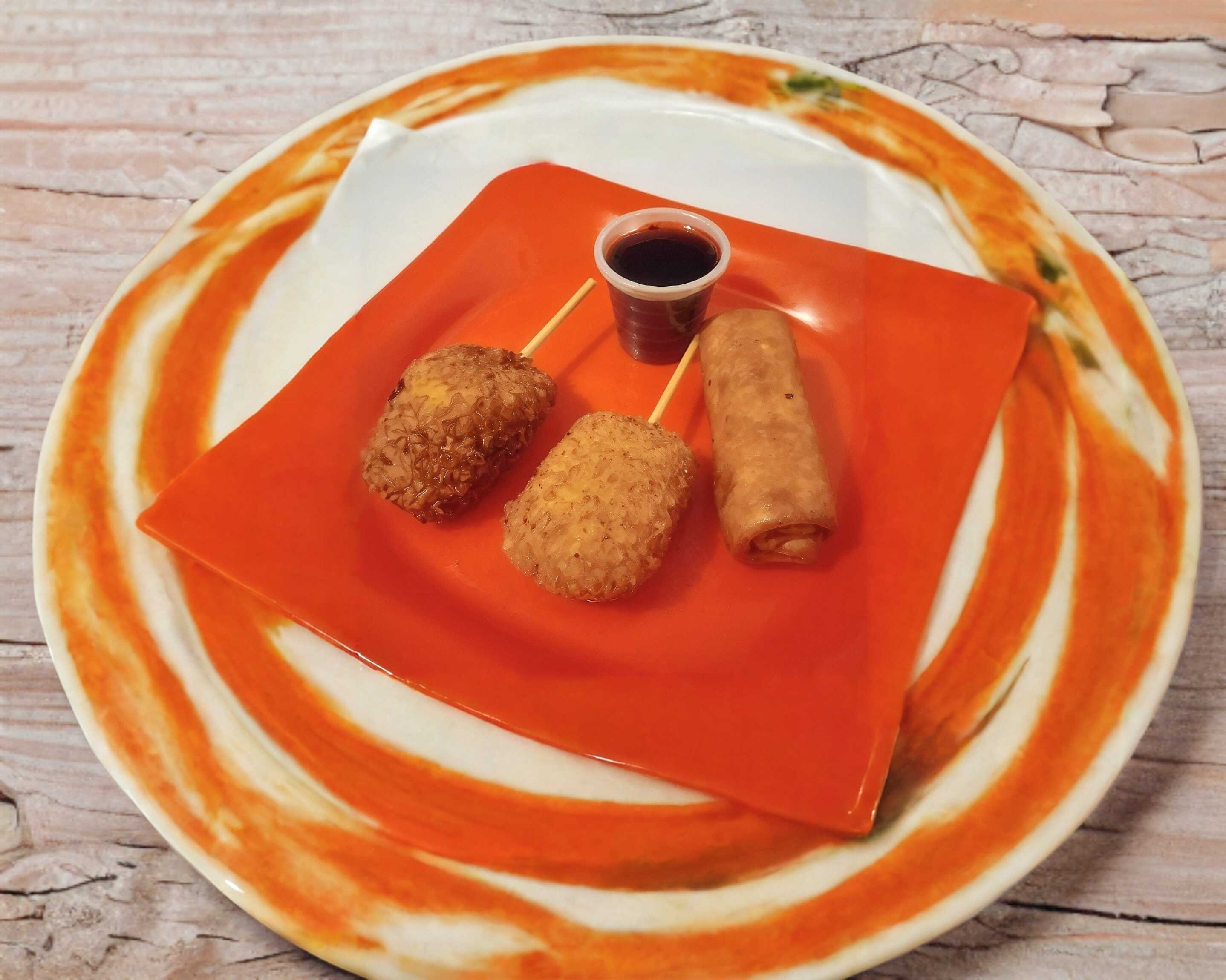 2 Kushiagues de queso, 2 kushiagues de plátano y 2 rollitos primavera.
