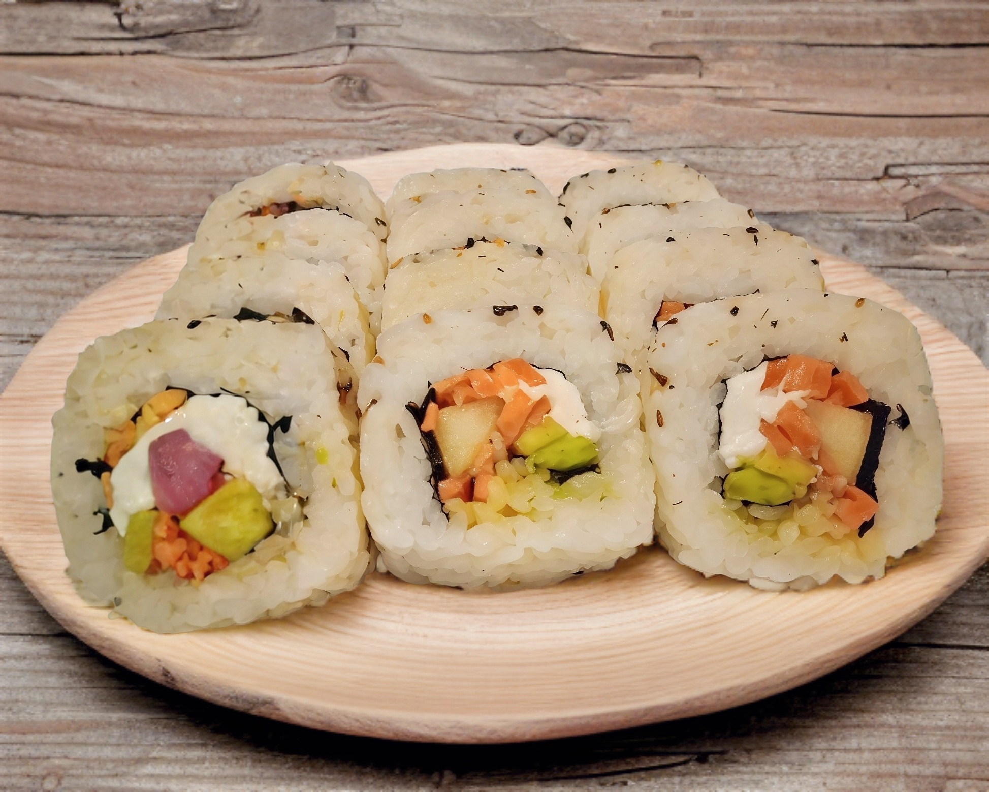Por dentro queso philadelphia, zanahoria, pepino, aguacate y por fuera ajonjolí.