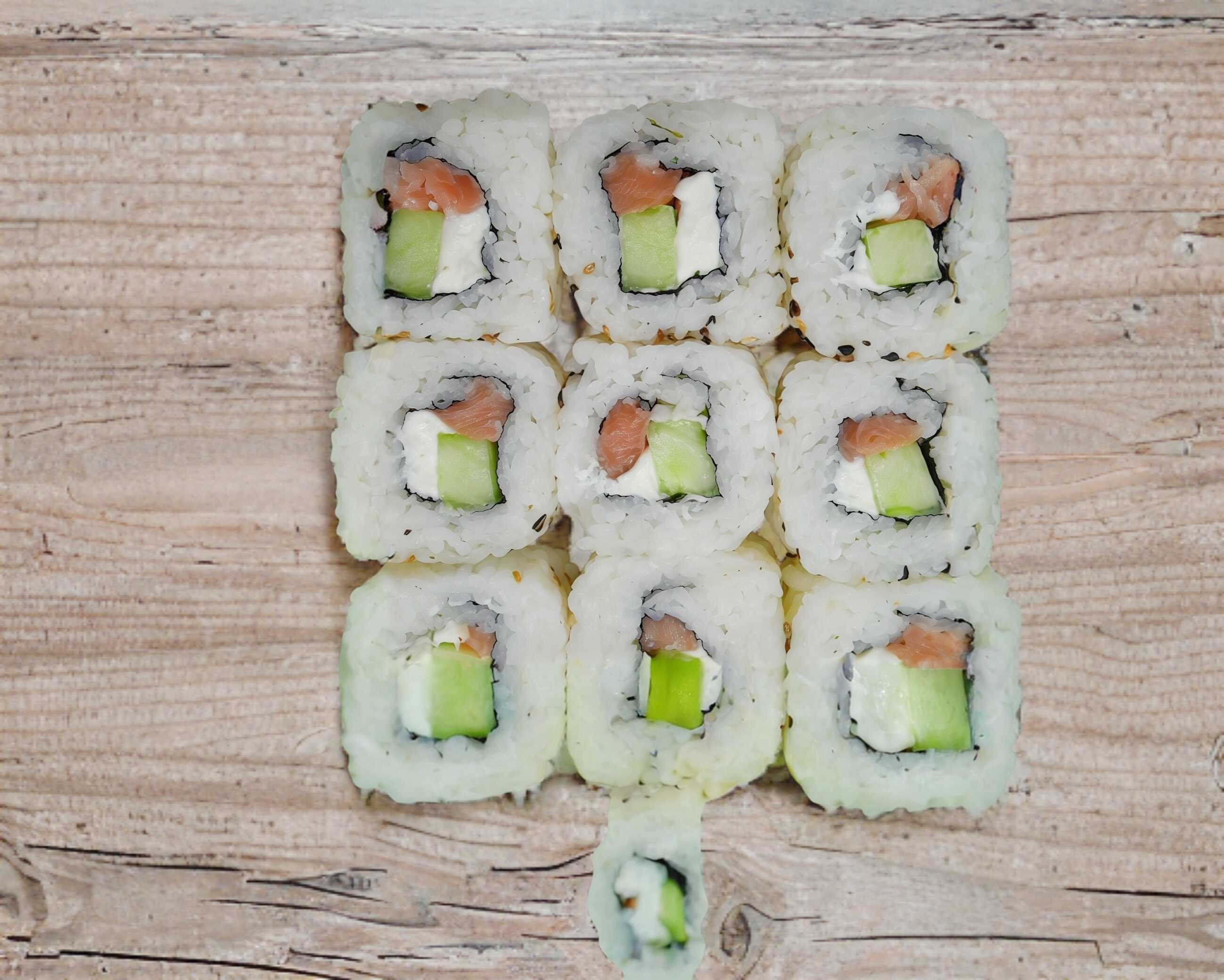 Por dentro queso philadelphia, pepino, salmón, por fuera ajonjolí.