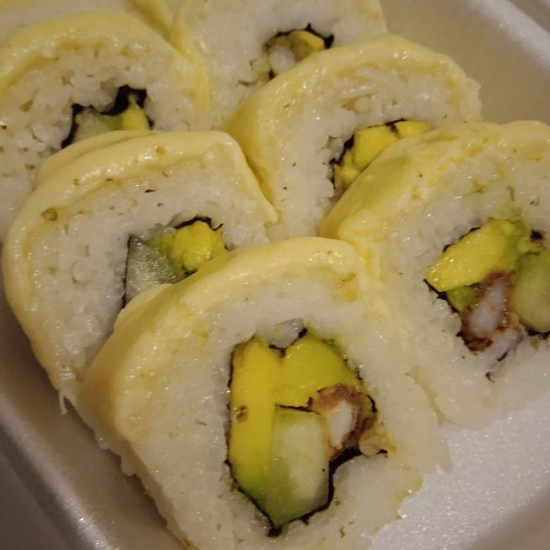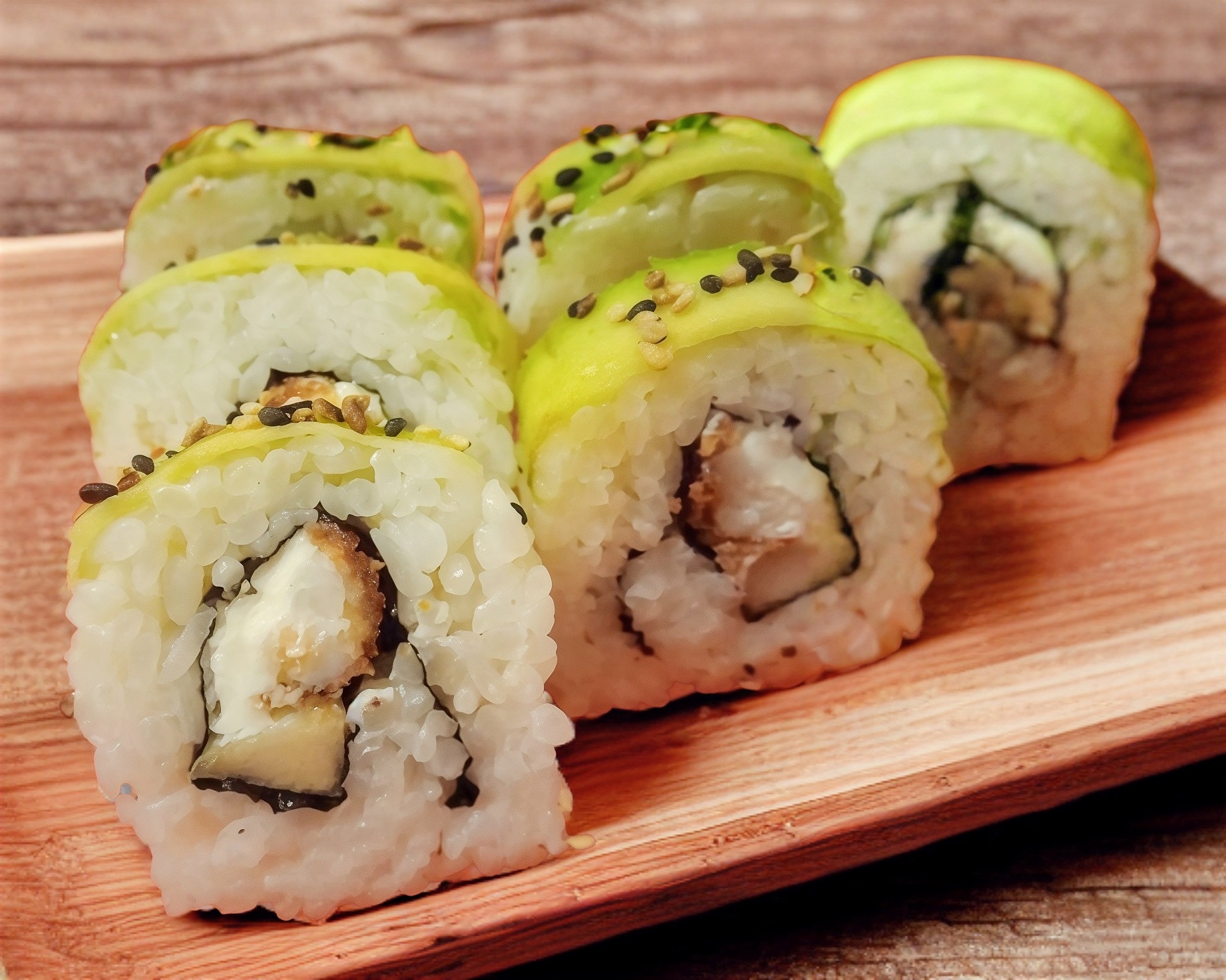 Por dentro queso philadelphia, pepino, camarón, por fuera aguacate y ajonjolí.