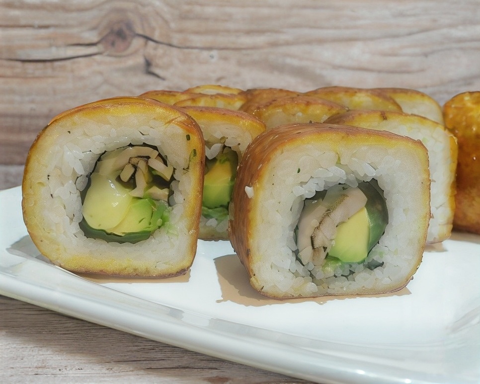 Por dentro queso philadelphia, aguacate, surimi, por fuera plátano macho frito.
