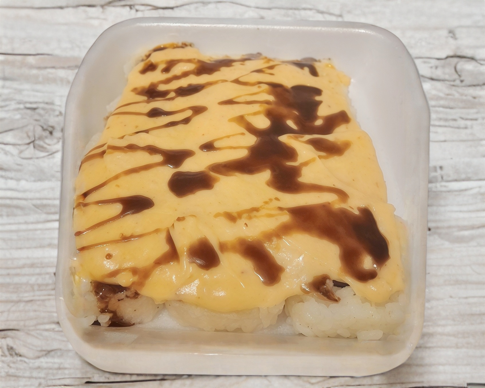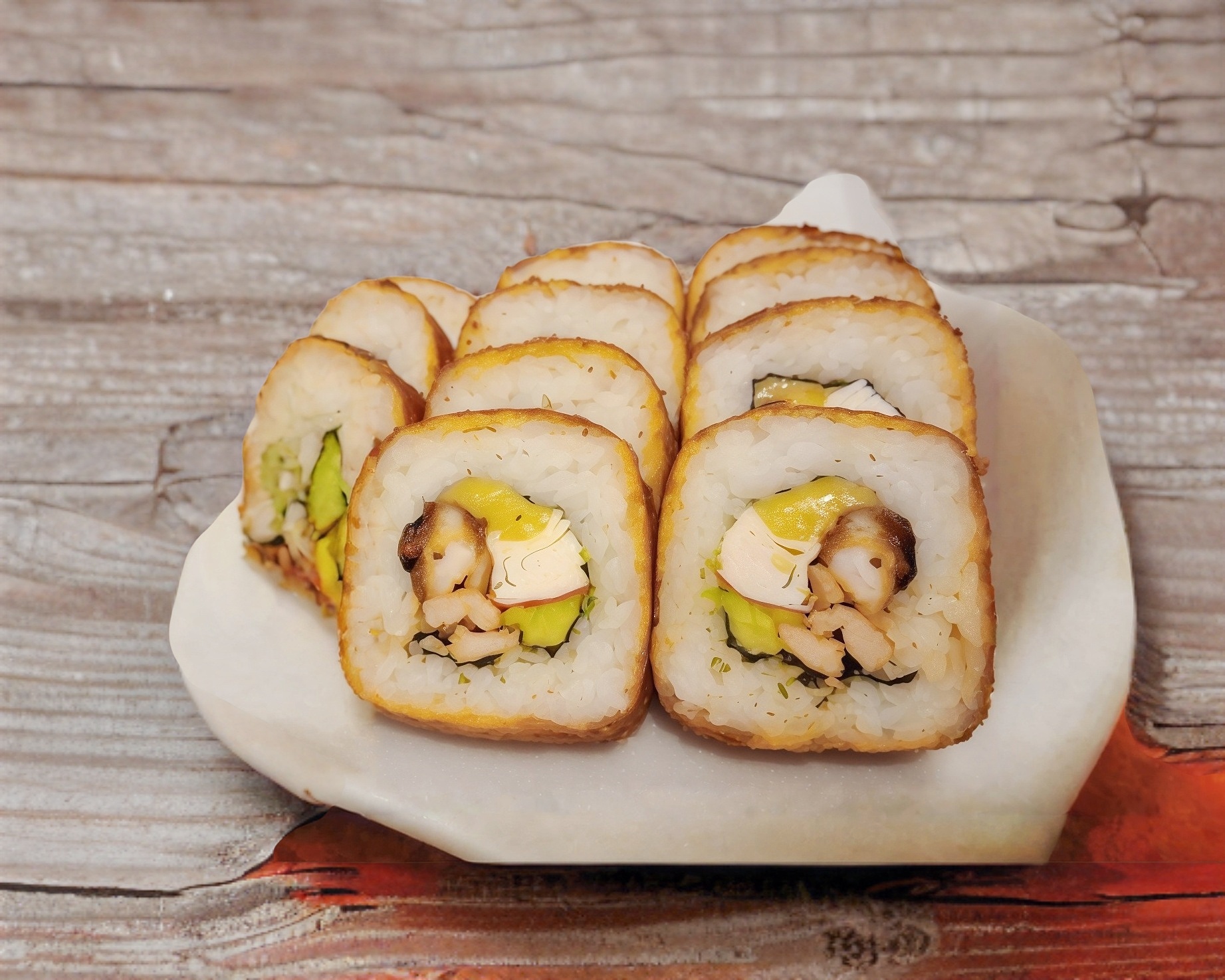 Por dentro queso philadelphia, aguacate, camarón, por fuera aderezo de chipotle con queso manchego y salsa de anguila.