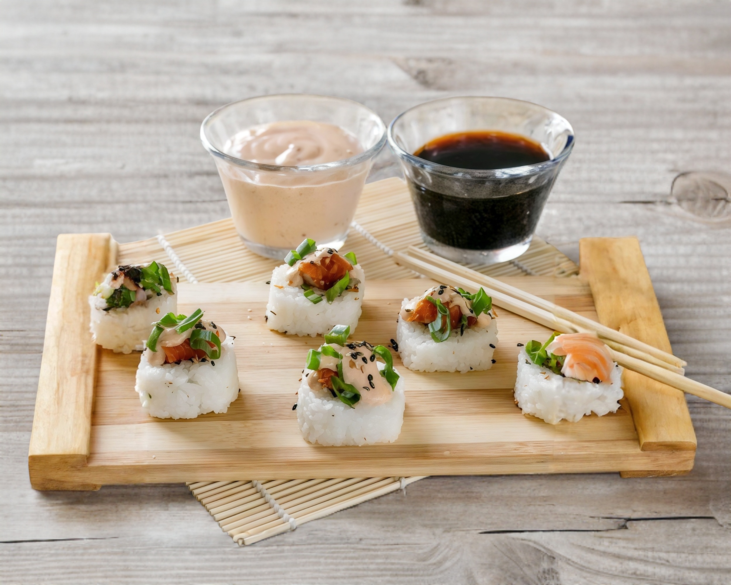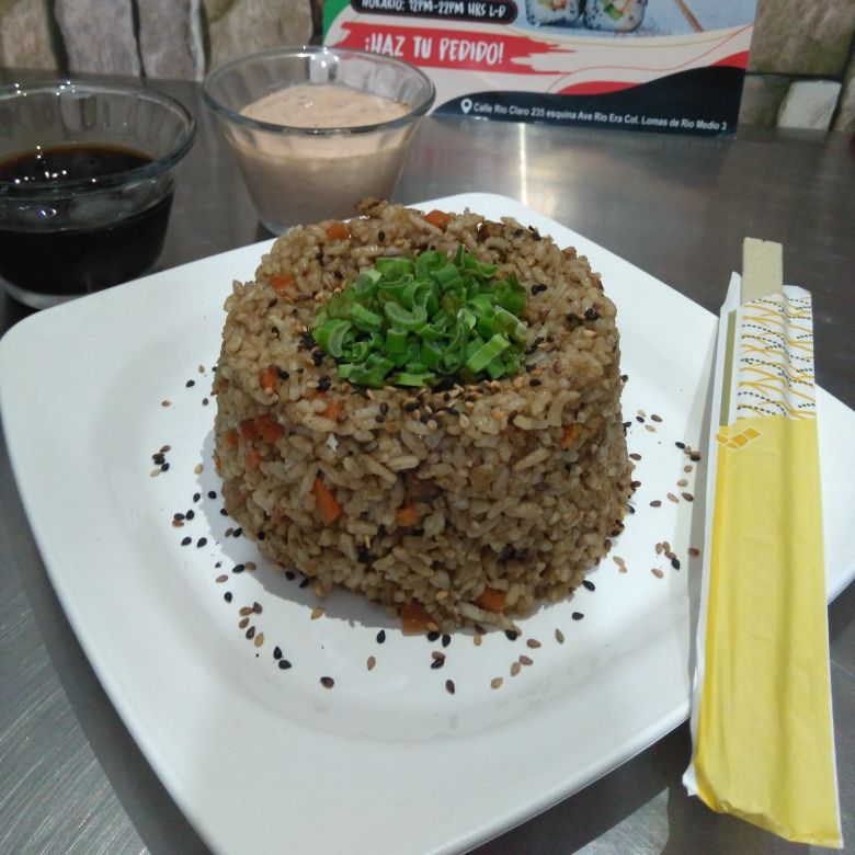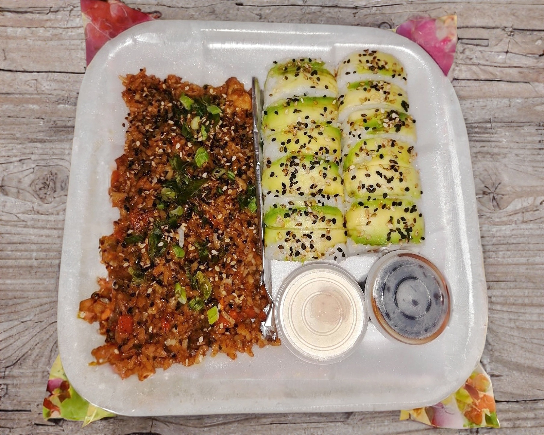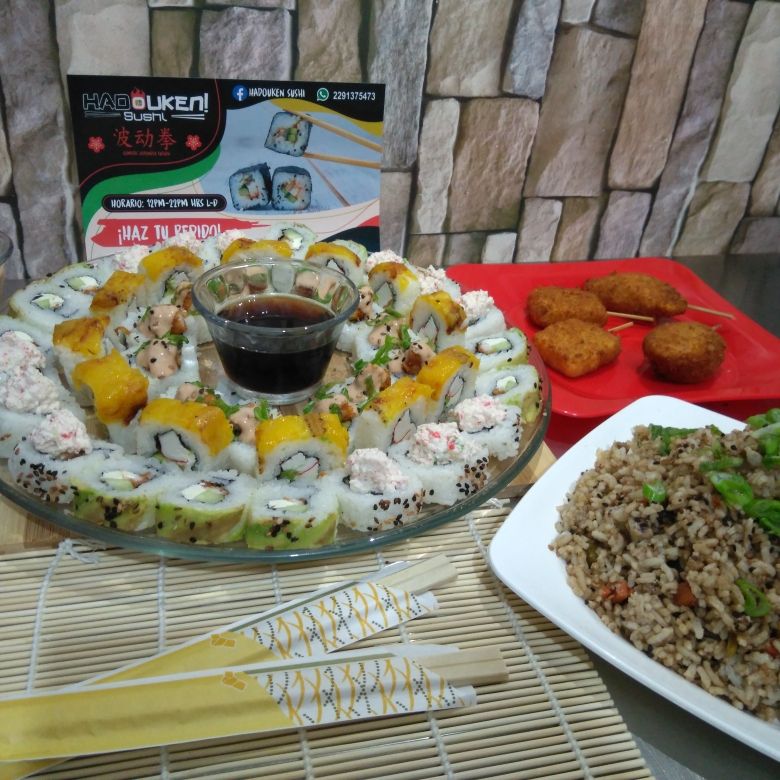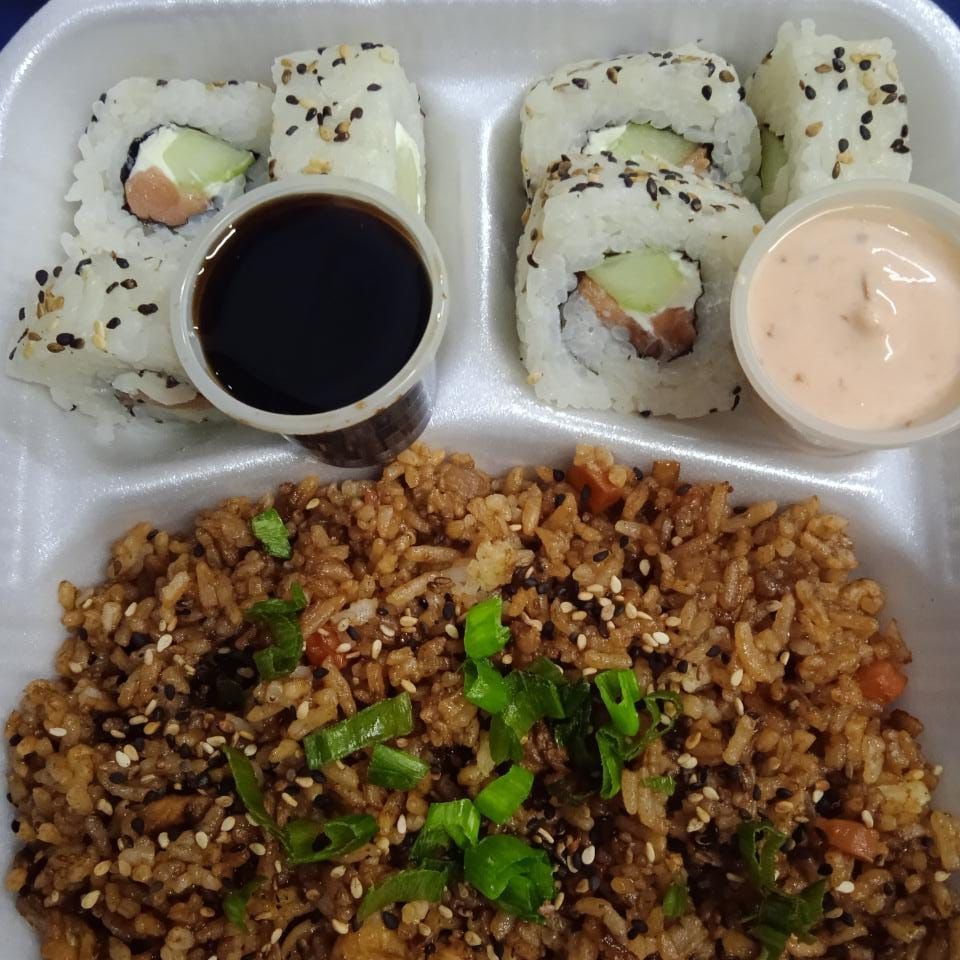 3 Rollos tradicionales, 1 de especialidad, yakimeshi con carne jumbo, 2 kushiagues de queso y 2 kushiagues de plátano.