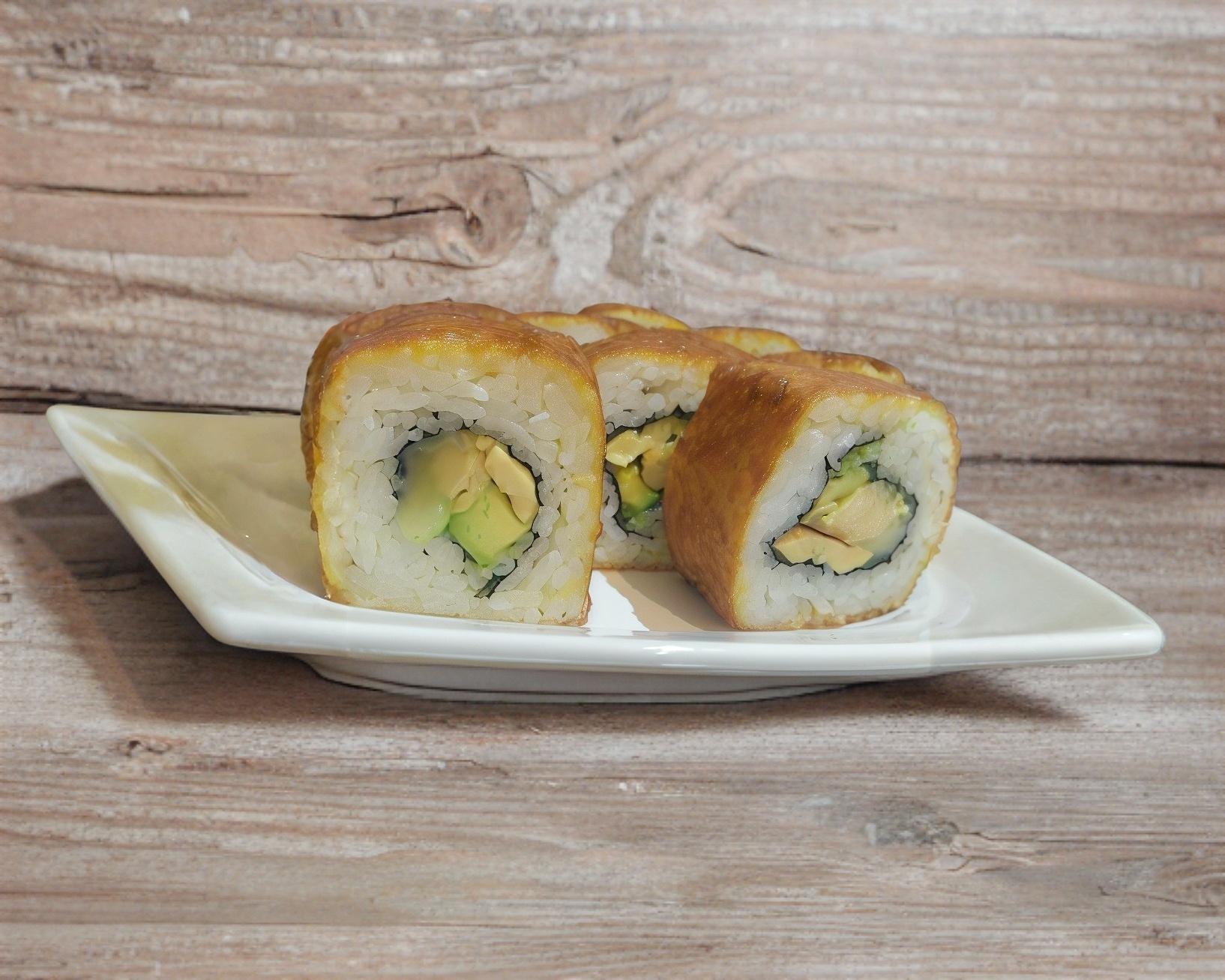 Por dentro queso manchego, aguacate, pepino, camarón, por fuera empanizado y tampico.