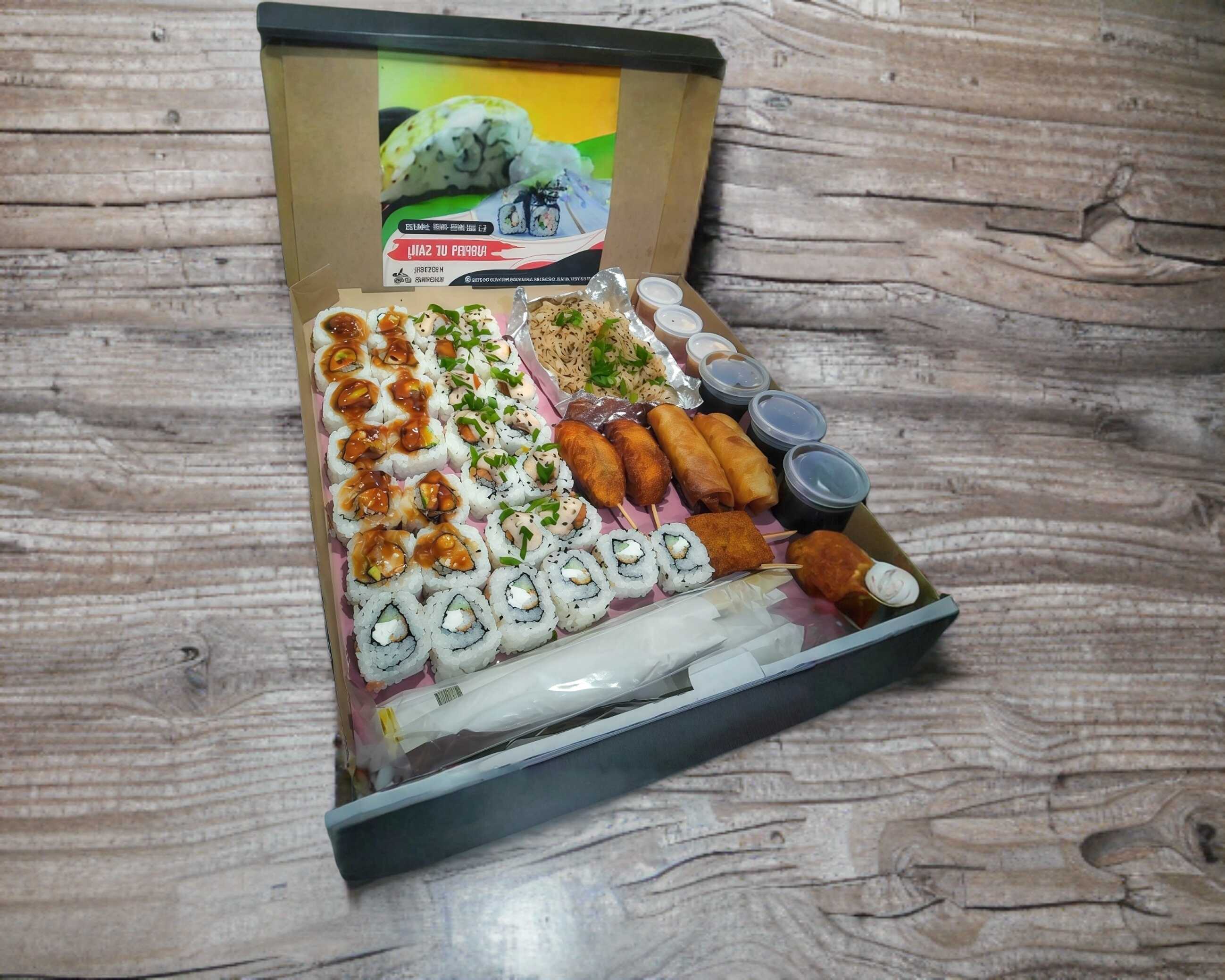 30 Piezas de sushi de rollos tradicionales, botana mixta grande y arroz yakimeshi con carne.