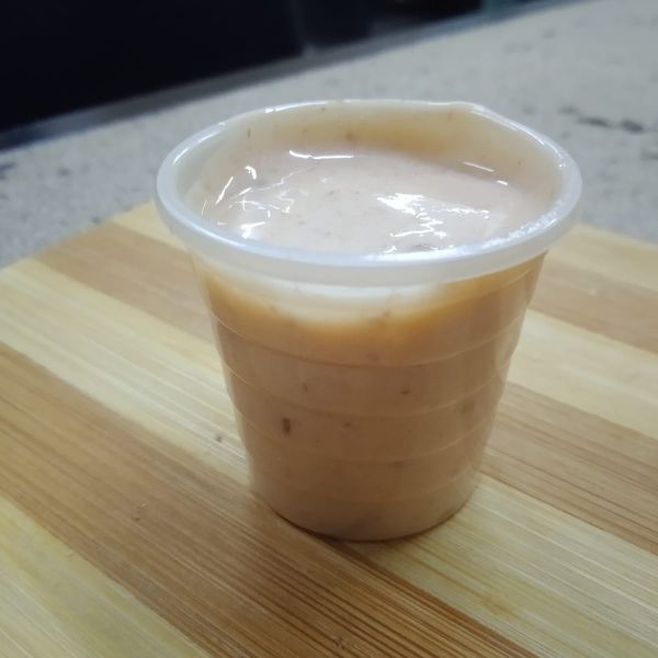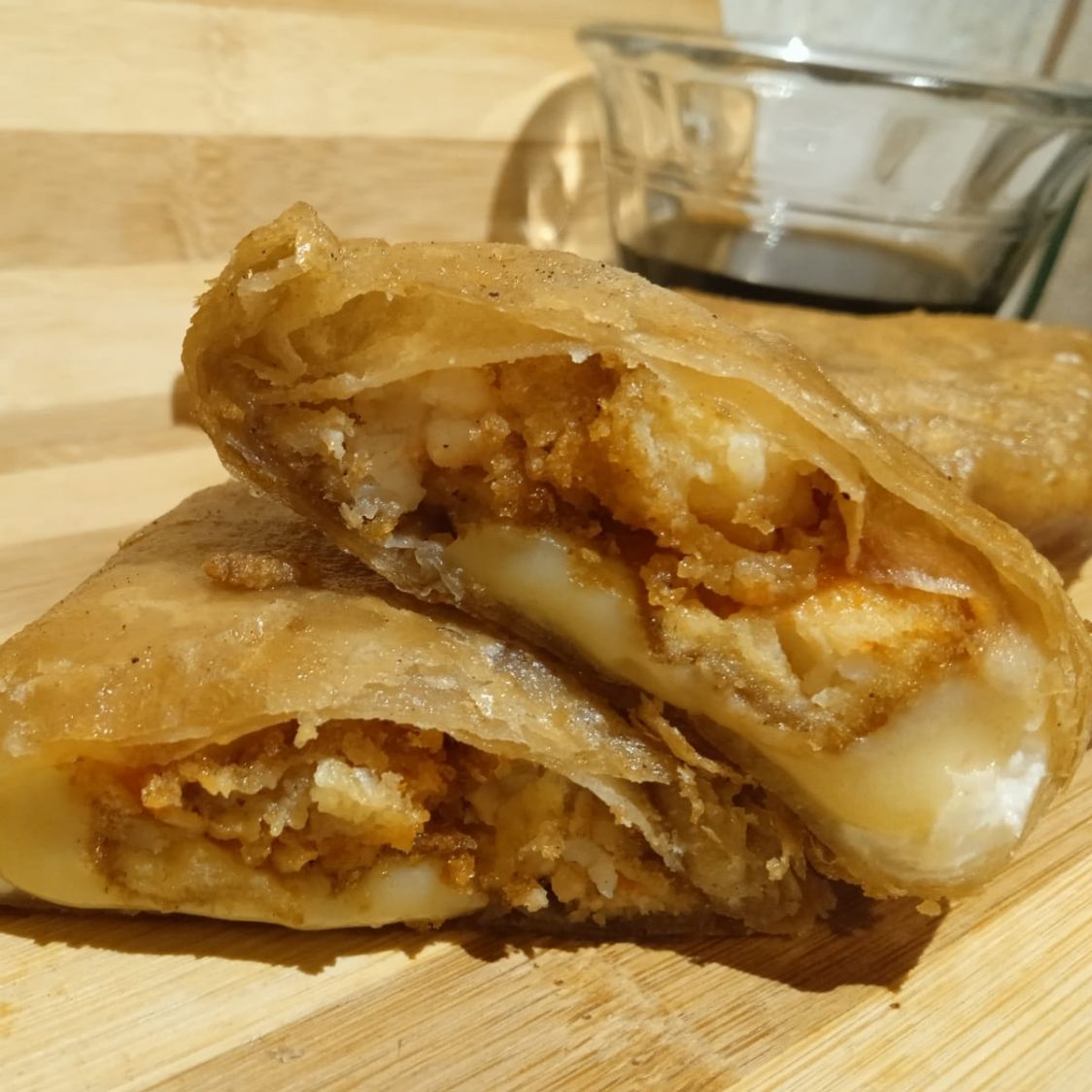 Tortilla de harina frita rellena de camarón, queso Philadelphia, Queso gouda, aderezo spicy