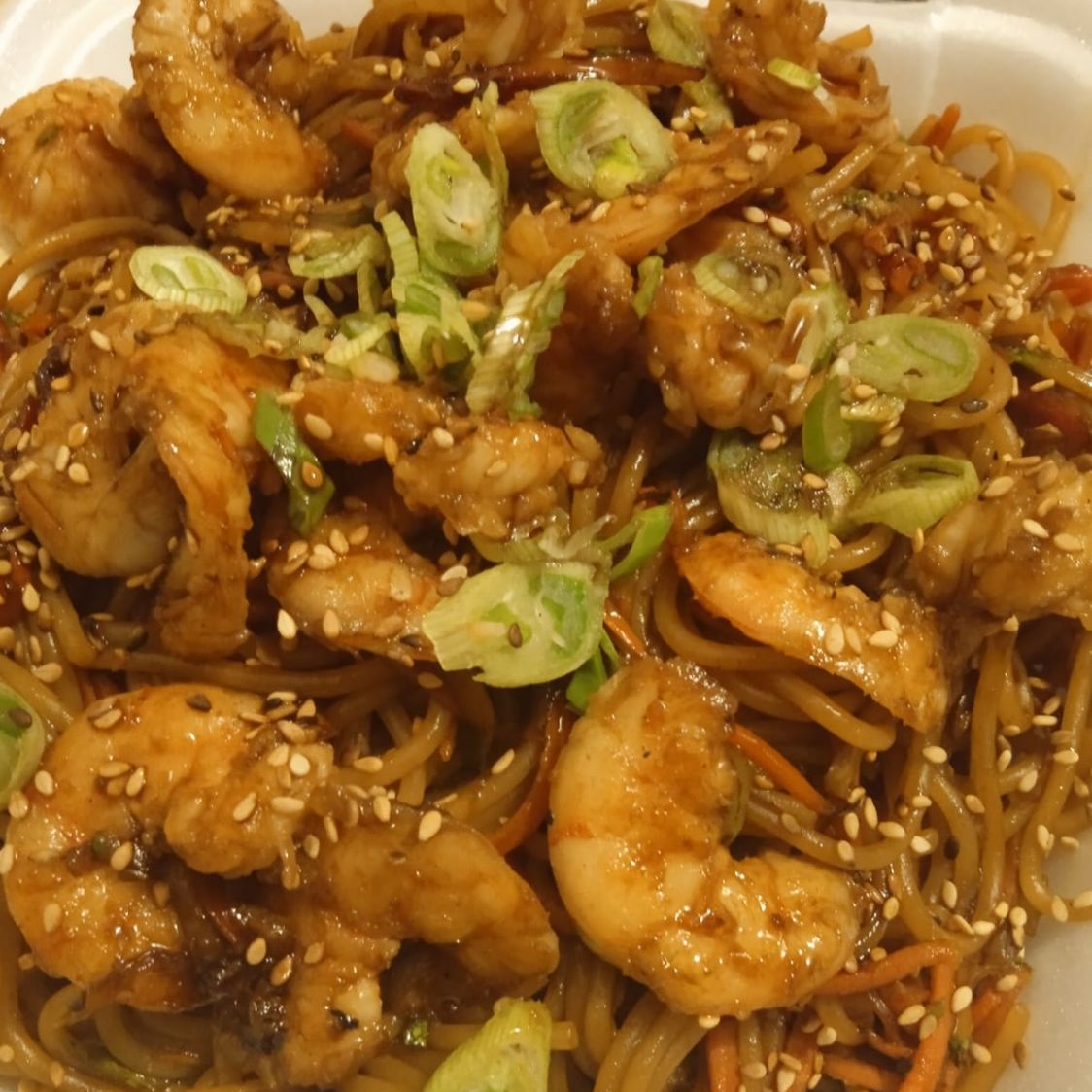 Pasta spaghetti con verduras sazonadas con salsa dulce y camarones con un toque de ajonjolí.