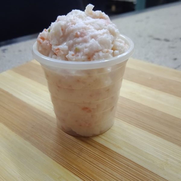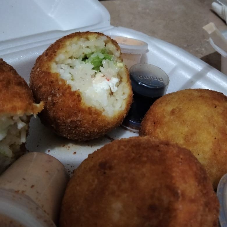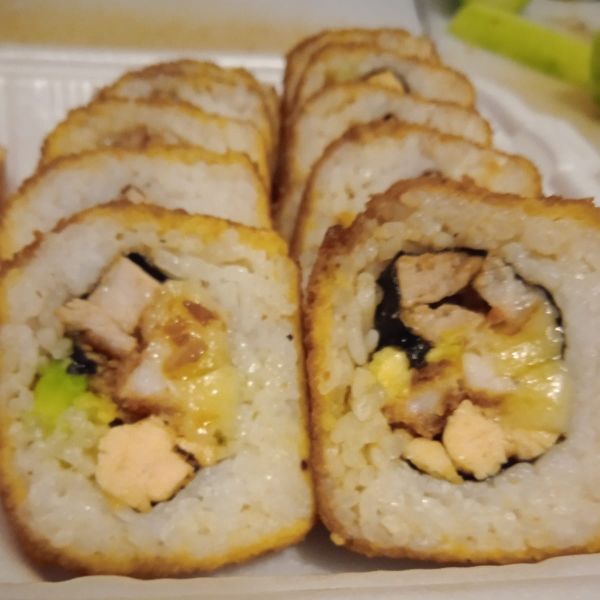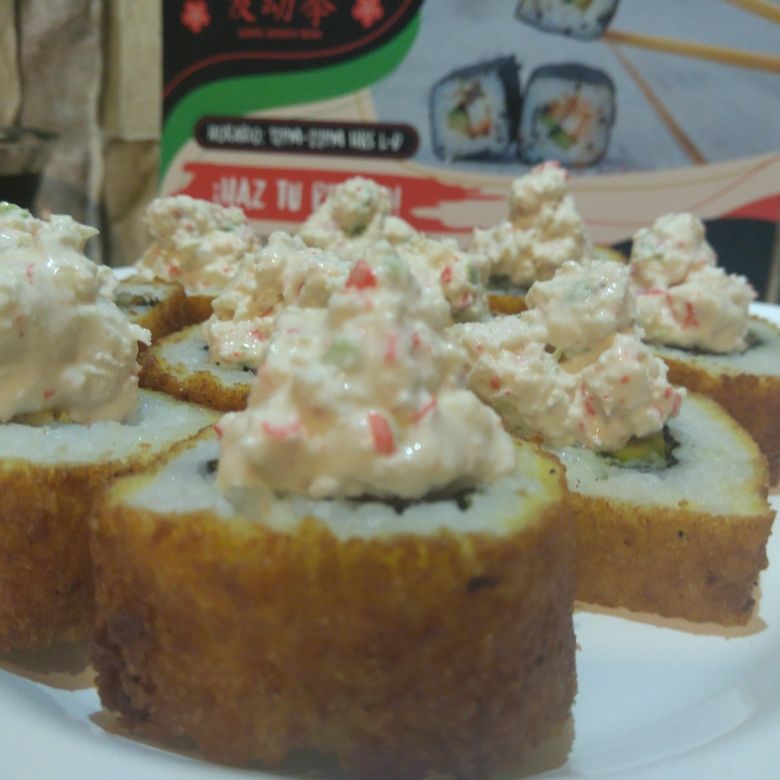 Por dentro queso manchego, carne, camarón, aguacate, surimi, por fuera empanizado.