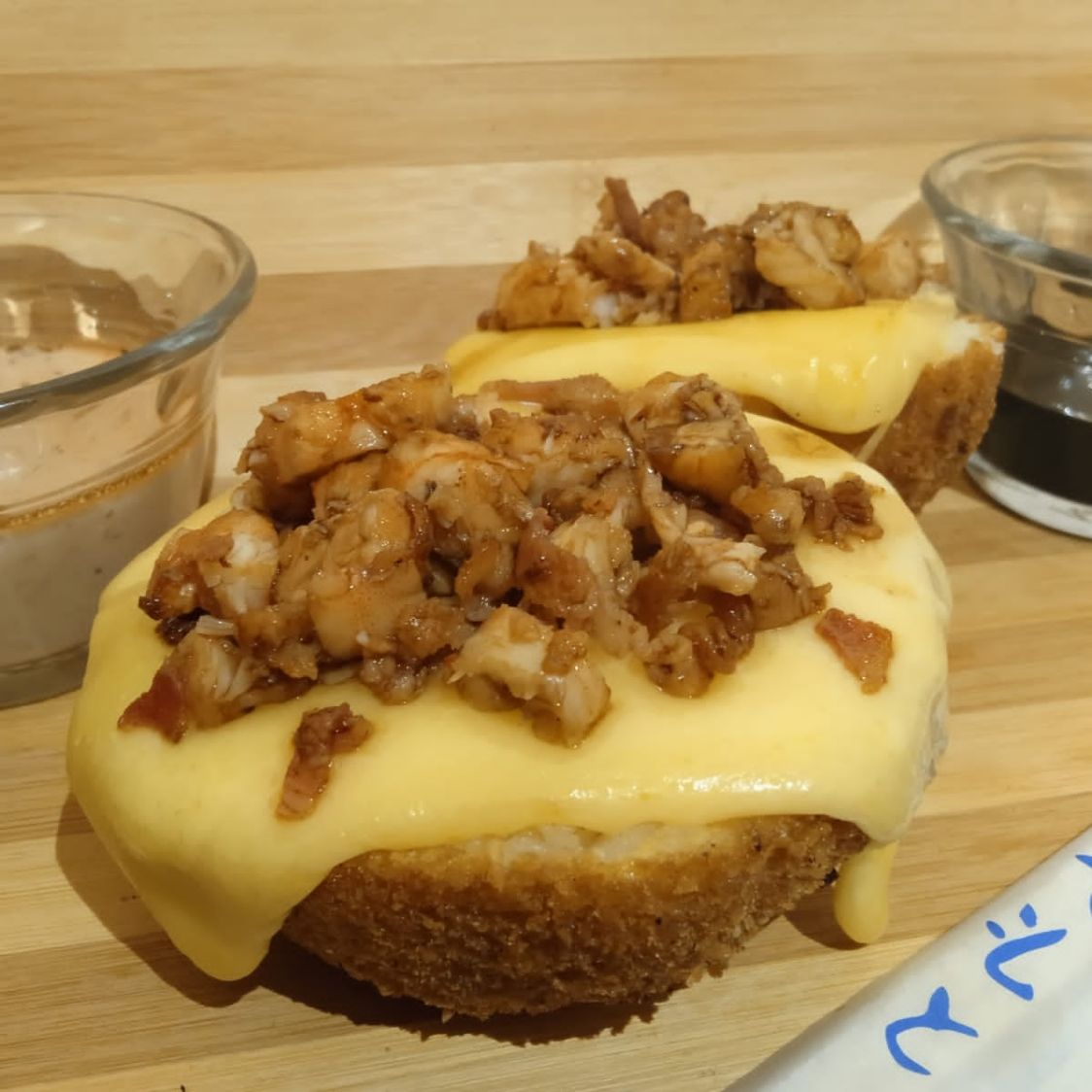 Bomba tradicional grande coronada con Queso gouda, Camarones al anillo y trocitos de tocino