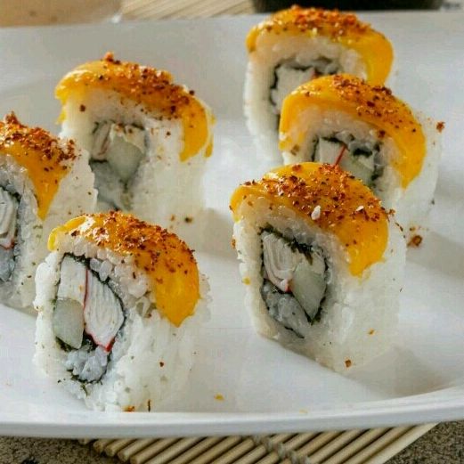 Por dentro queso philadelphia, surimi, pepino, por fuera mango y chile Tajín.