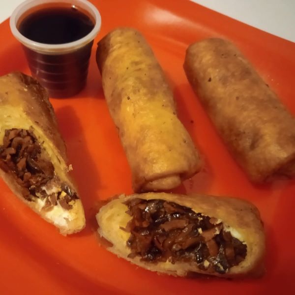 1 Kushiague de queso, 1 kushiague de plátano y 1 rollito primavera.