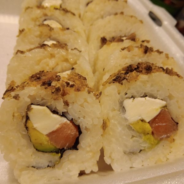 Por dentro queso philadelphia, aguacate, salmón, por fuera aderezo de chipotle y salmón crunch.
