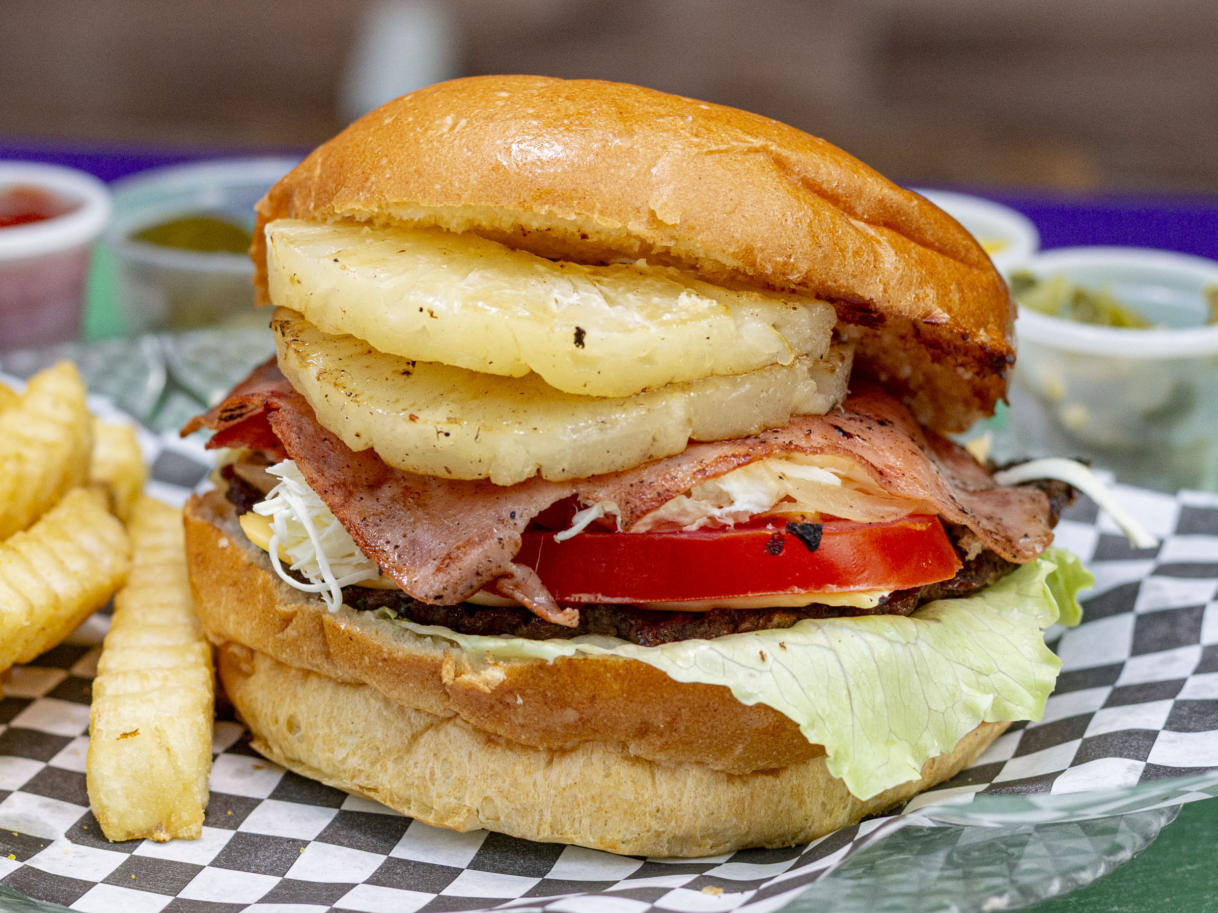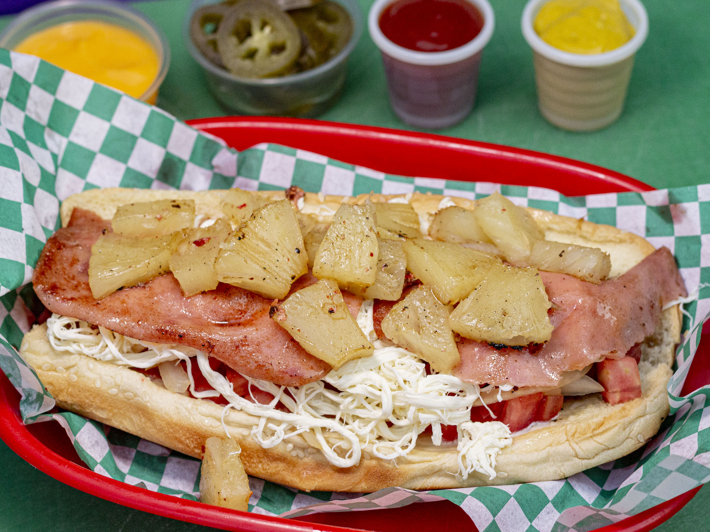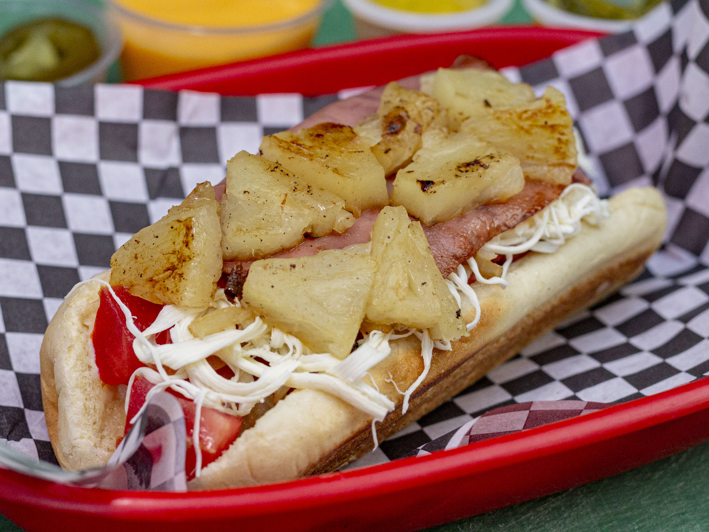 Carne de res, tocineta, queso amarillo, queso de hebra, jamón de pavo, piña asada, tomate, cebolla y lechuga.