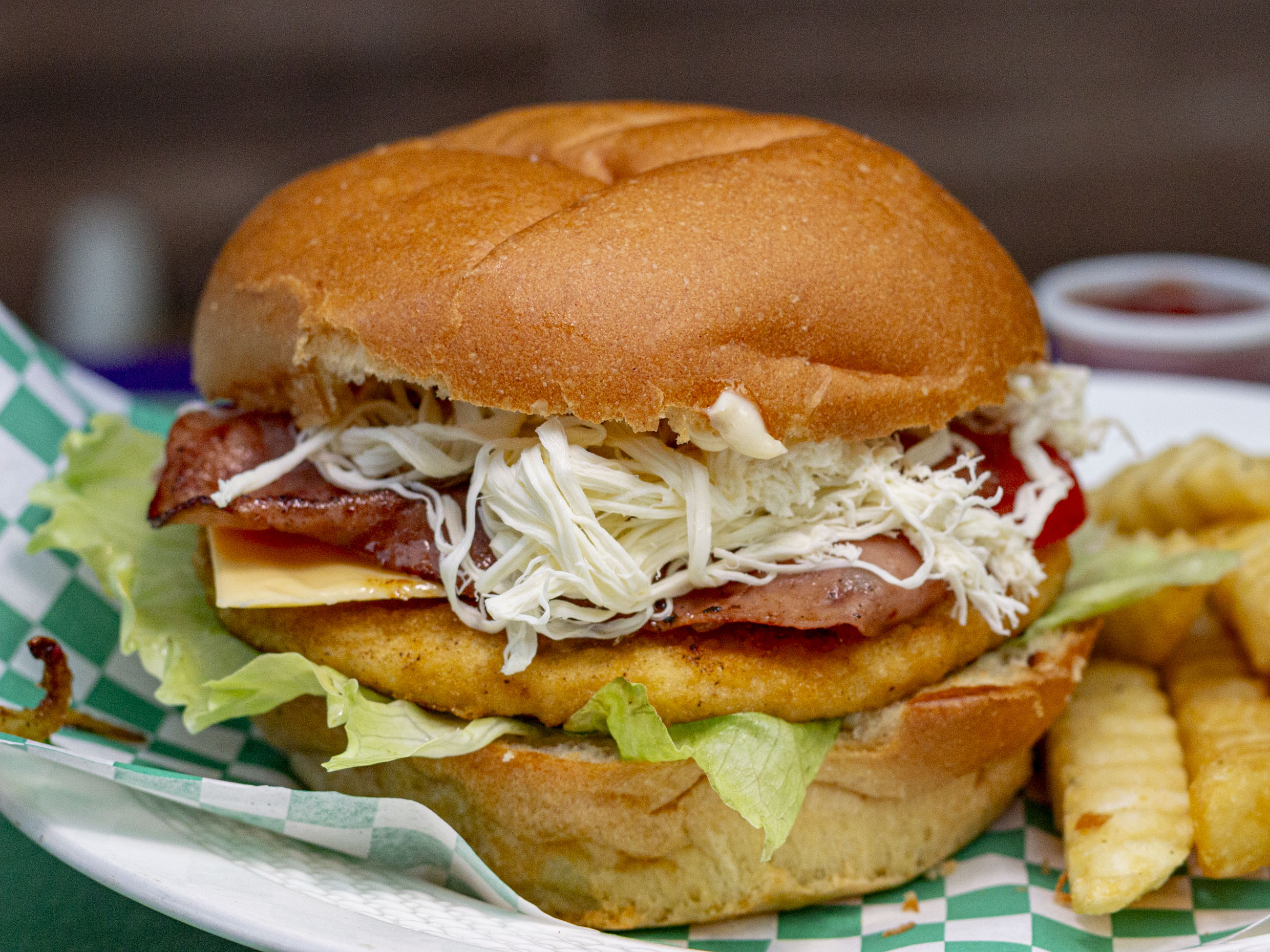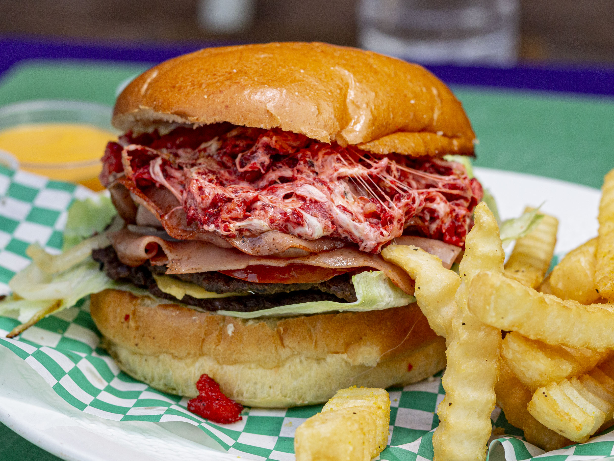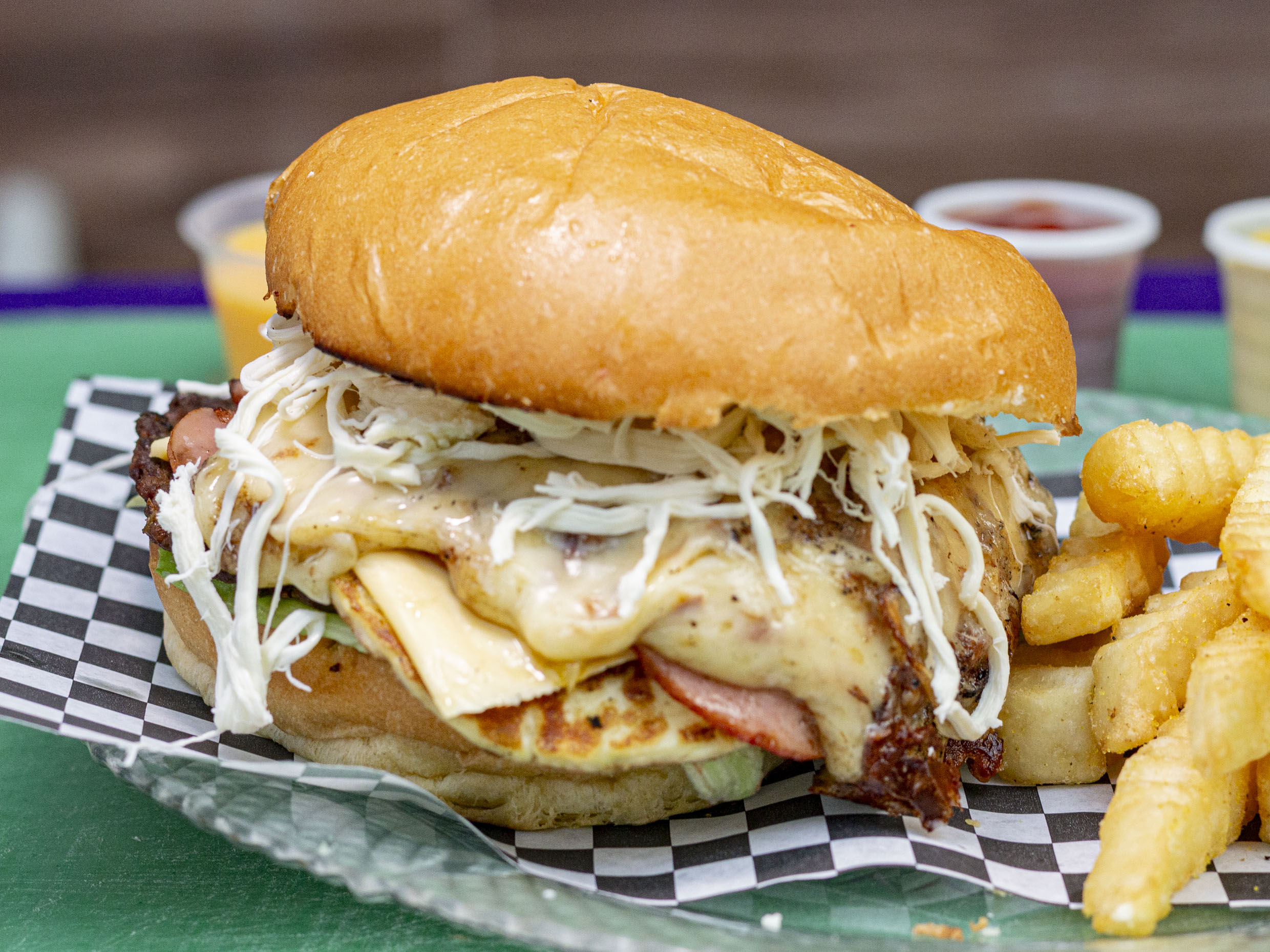 Carne de res, tocineta, queso amarillo, queso de hebra, jamón de pavo, piña asada, tomate, cebolla y lechuga.