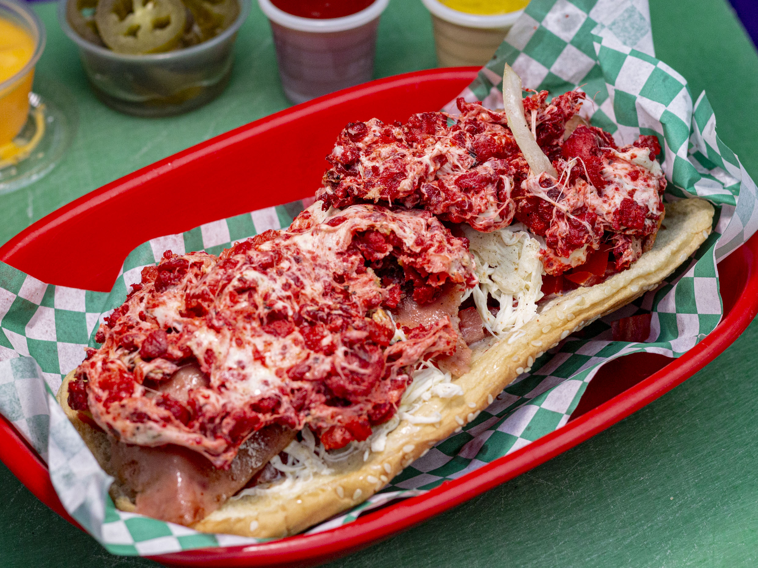 Doble carne de res, tocineta, salchicha, jamón de pavo, queso amarillo, queso de hebra gratinado, chorizo, tomate, cebolla y lechuga.