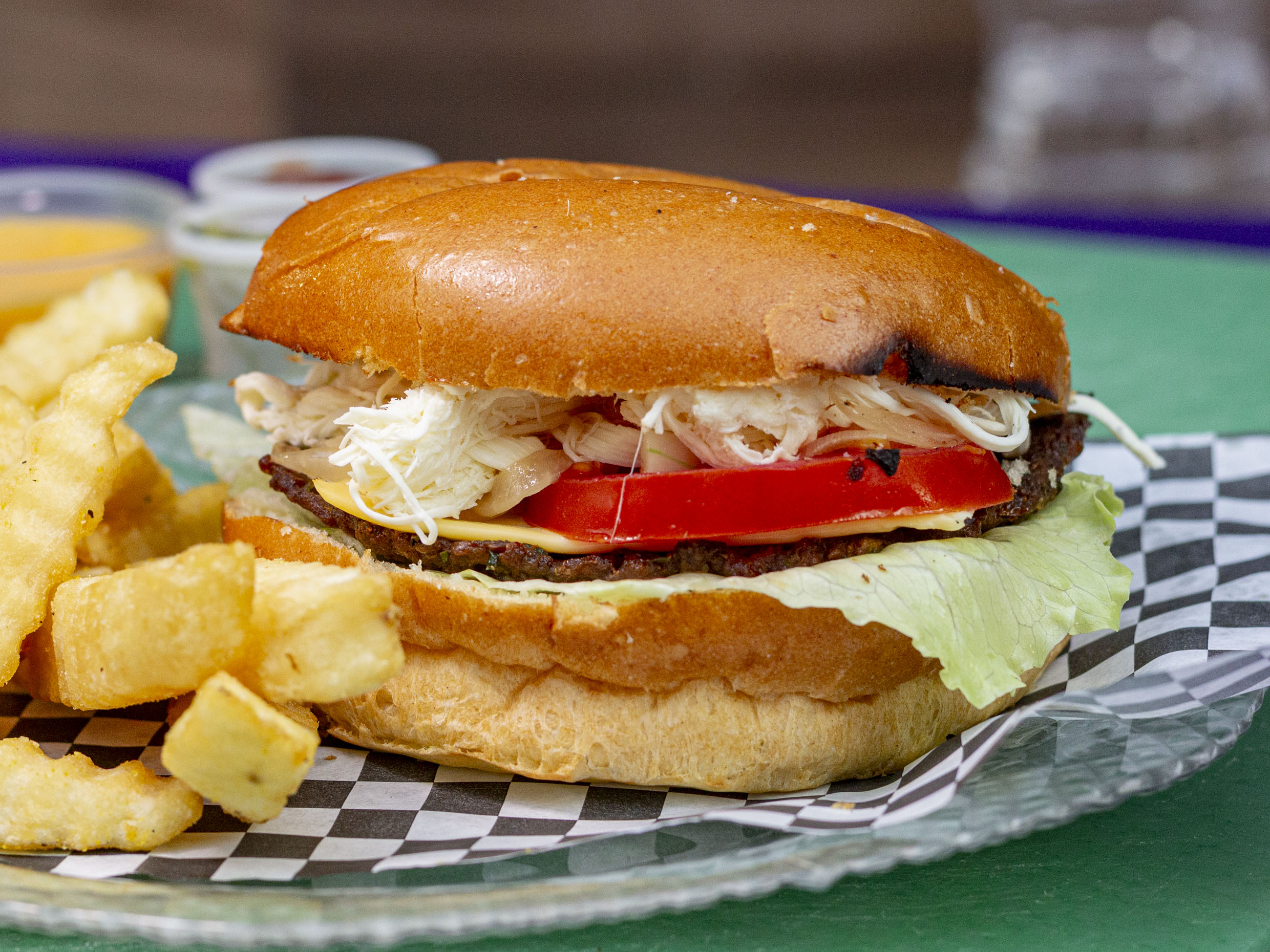 Carne de res, queso amarillo, queso de hebra, tomate, cebolla y lechuga.