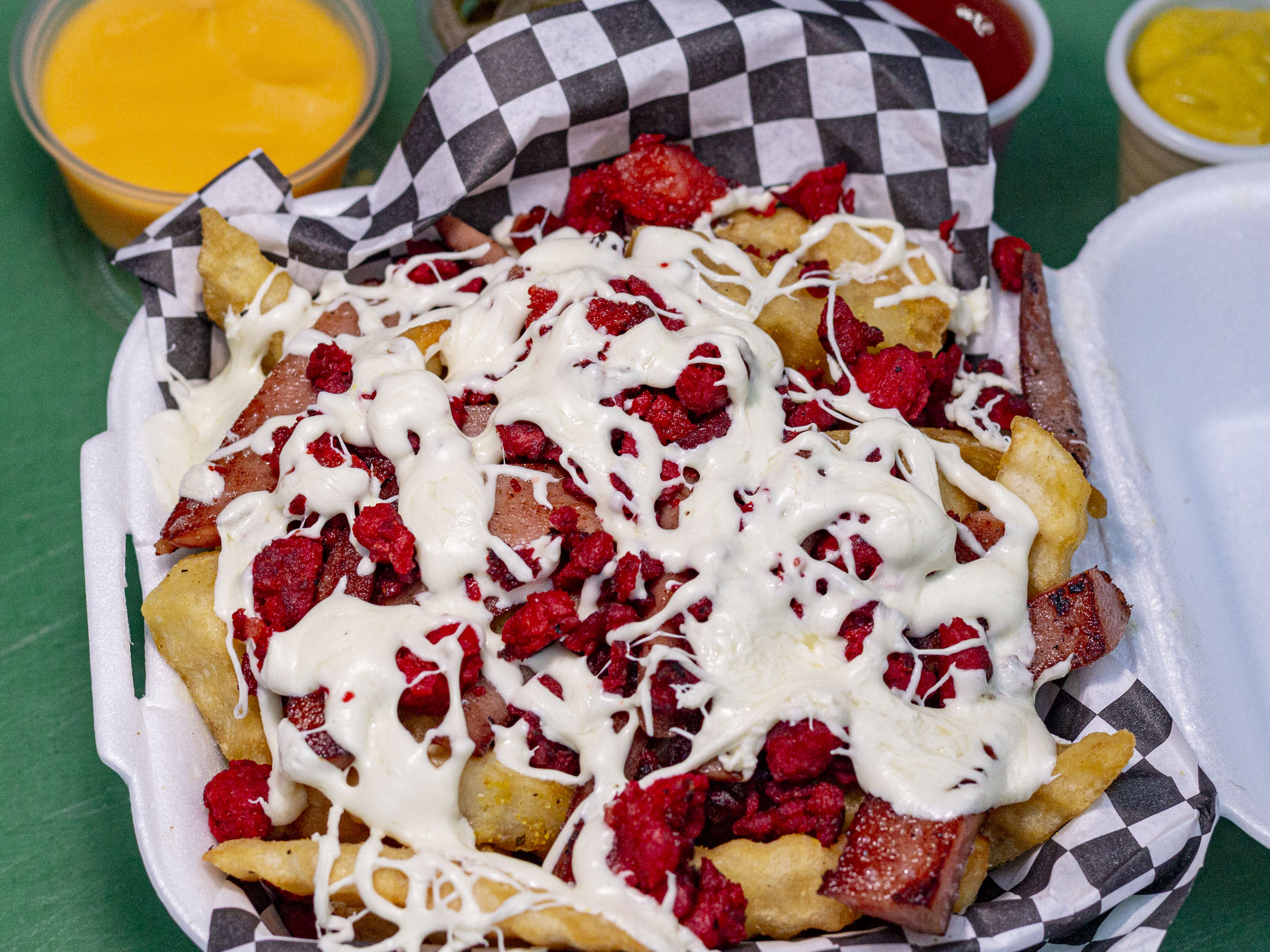 Una orden de papas con una deliciosa cobertura de queso de hebra gratinado con chorizo.