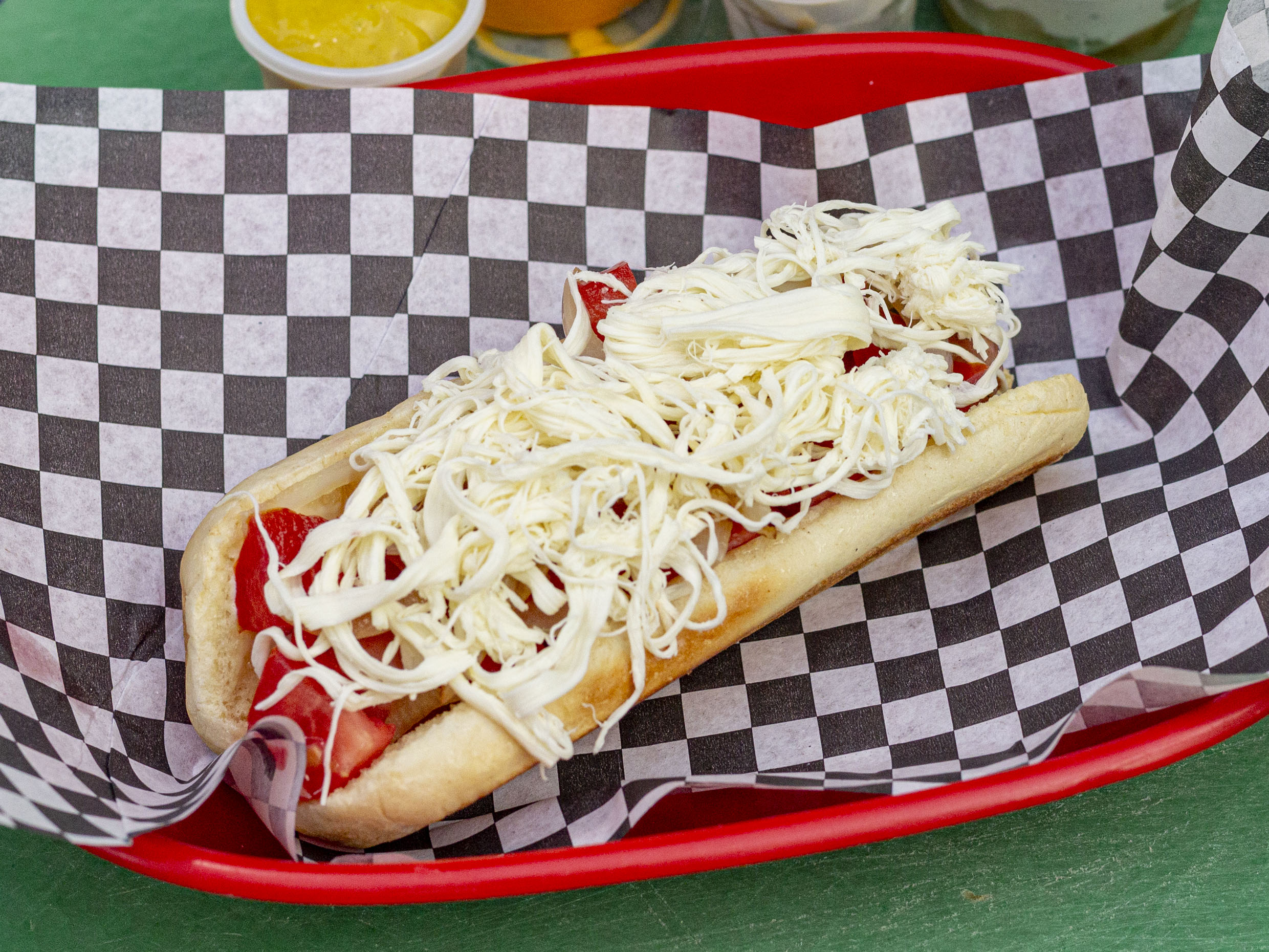 Salchicha de pavo, queso de hebra, tomate y cebolla.