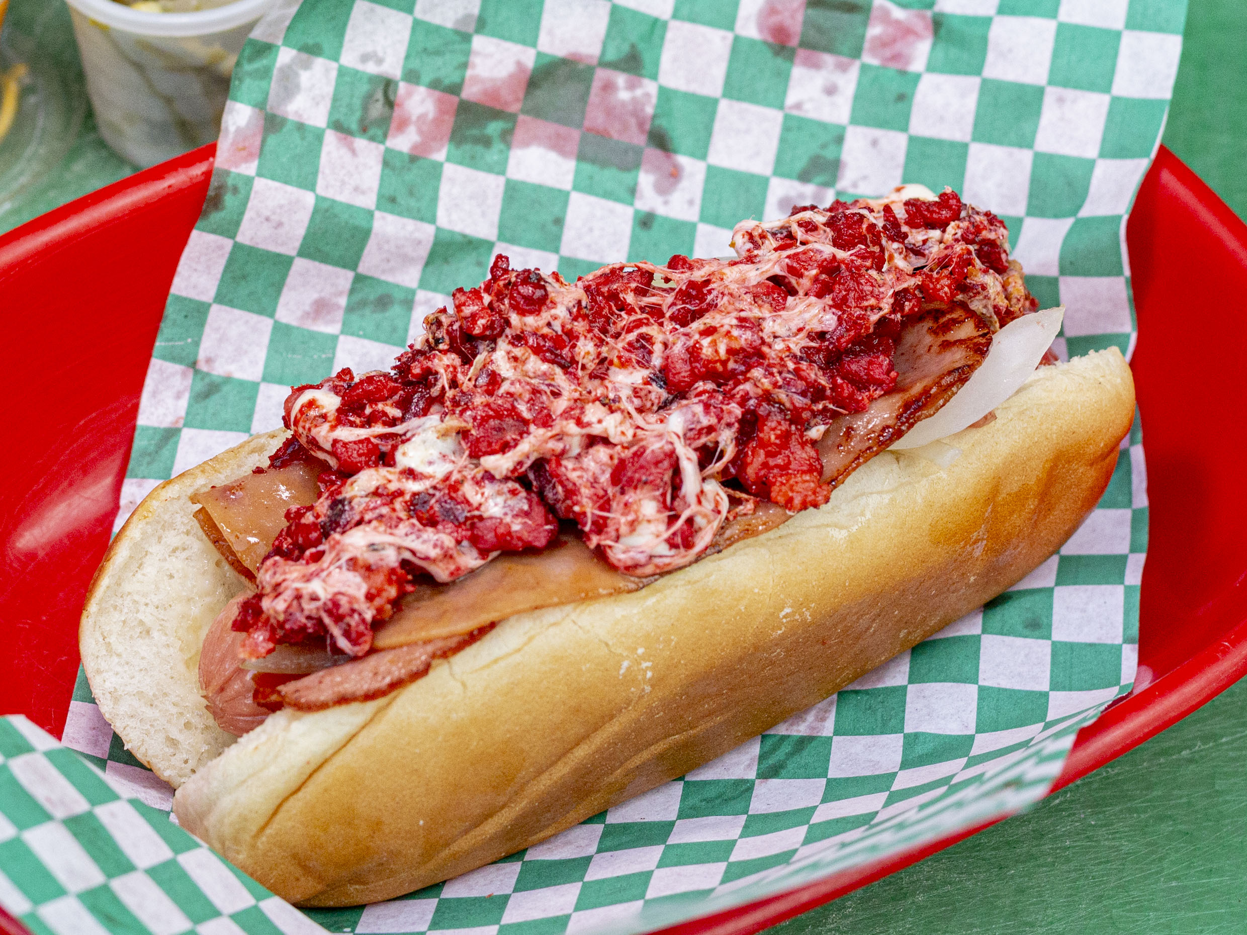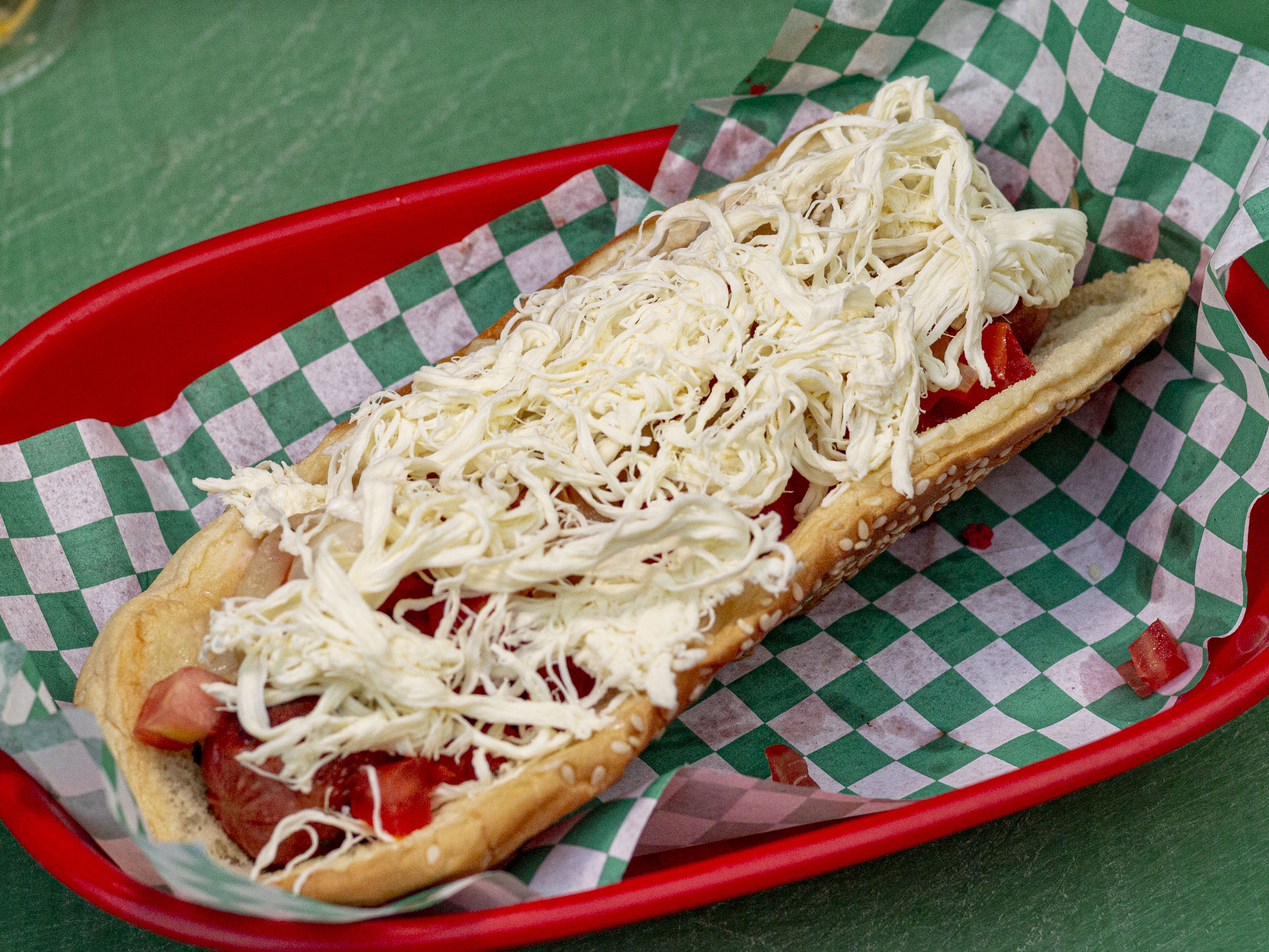 Salchicha de pavo, tocineta, queso de hebra, tomate y cebolla.